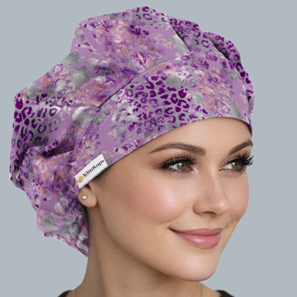 These purple leopard scrub caps are made in the USA of 100% cotton, and are designed to keep you cute and comfortable all shift long.