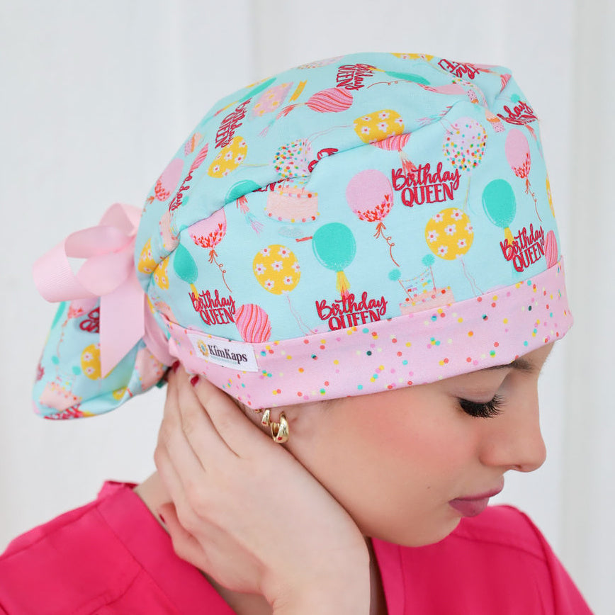The birthday queen deserves a birthday scrub cap, amirite? Cakes, candles, balloons, and the cutest-ever sprinkles coordinate bring smiles and celebration all around! We added pink ribbons for your ponytail in Style 6-2 and Style 10.