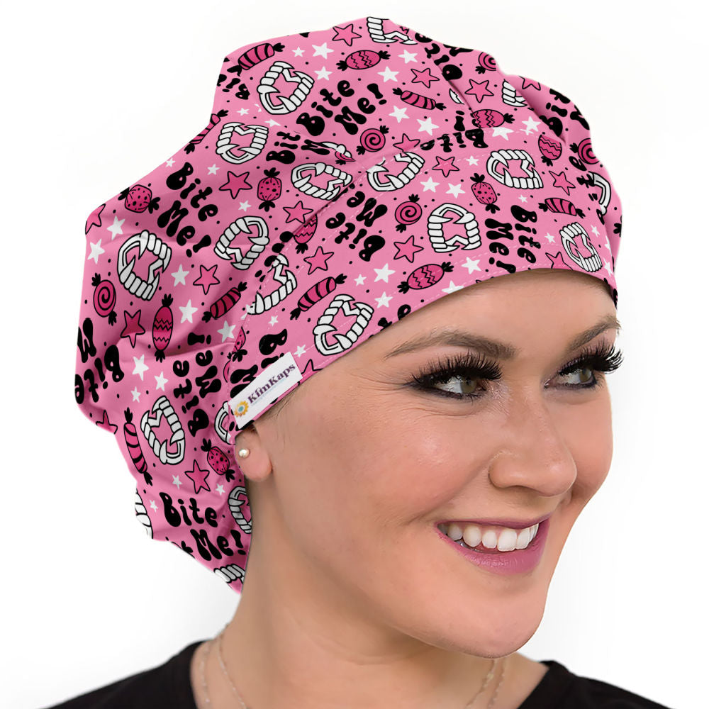 Sweet tooth or sharp tooth? This spooky-fun scrub cap serves up both! Bite Me features grinning vampire fangs alongside colorful Halloween candy for a look that’ll have you looking fang-tastic. Bold, playful, and just the right amount of spooky sass, it’s the perfect way to sink your teeth into the season.