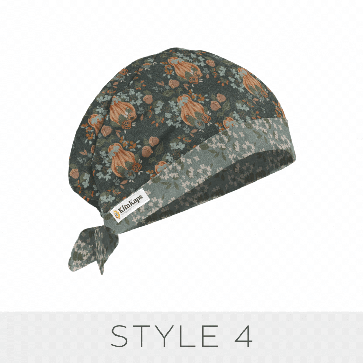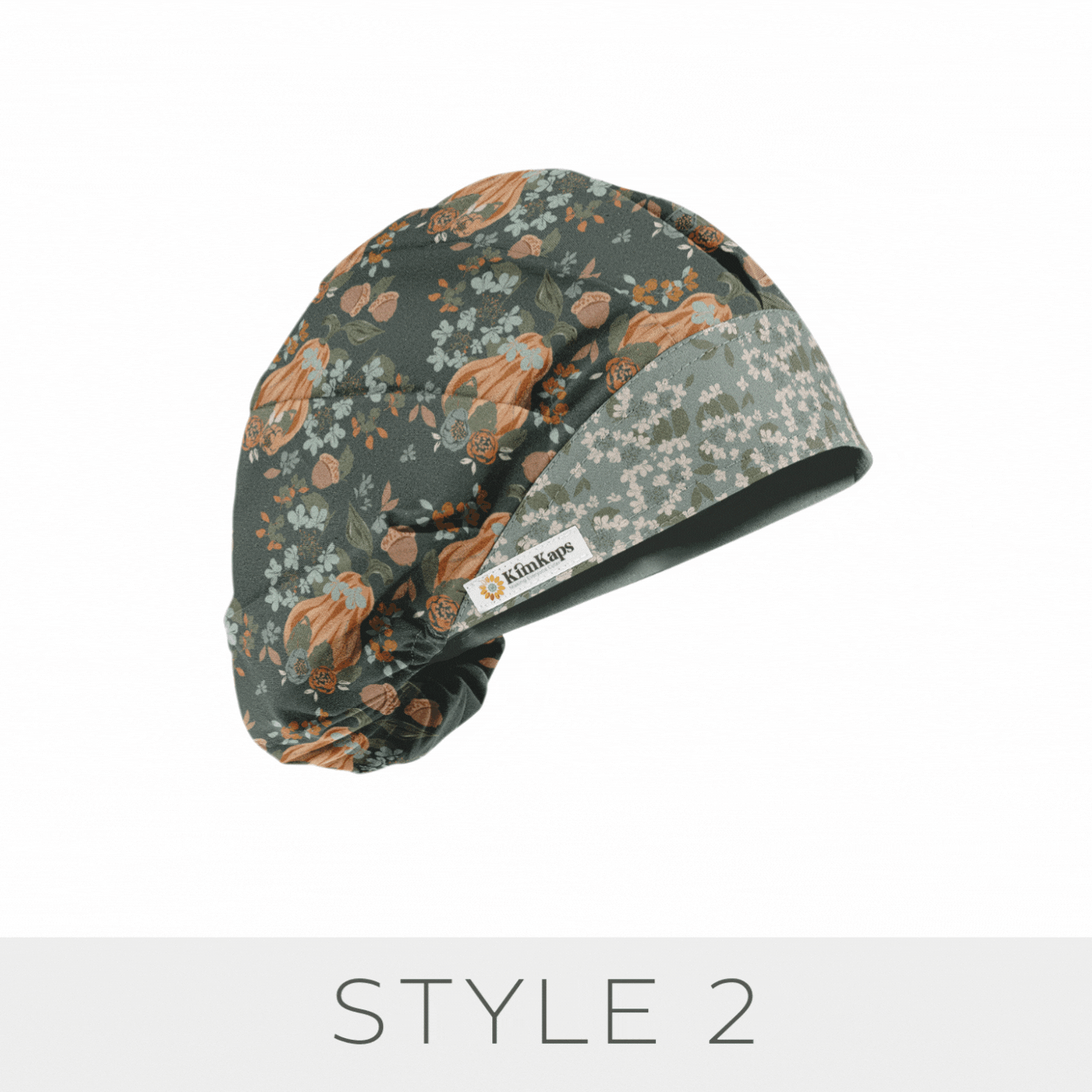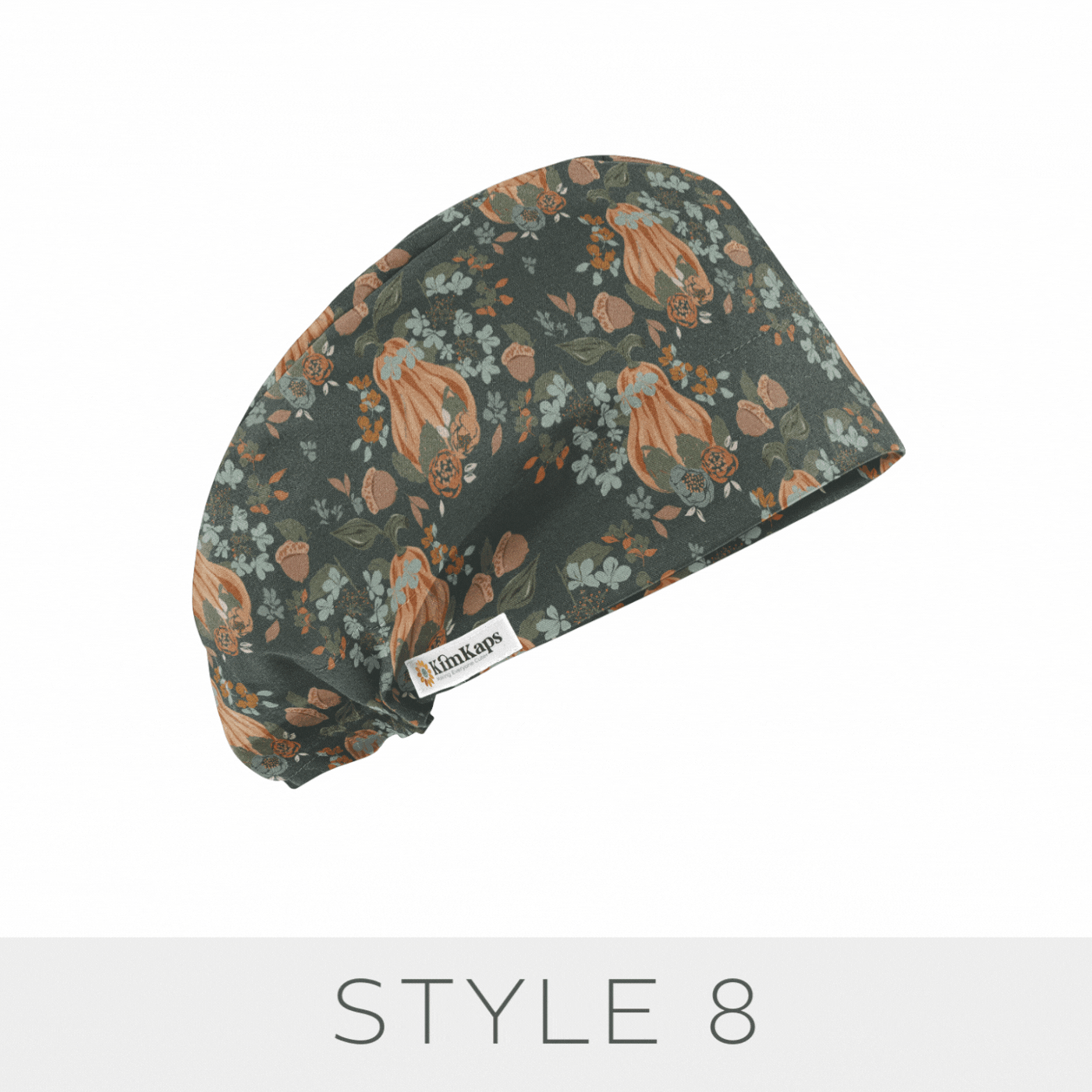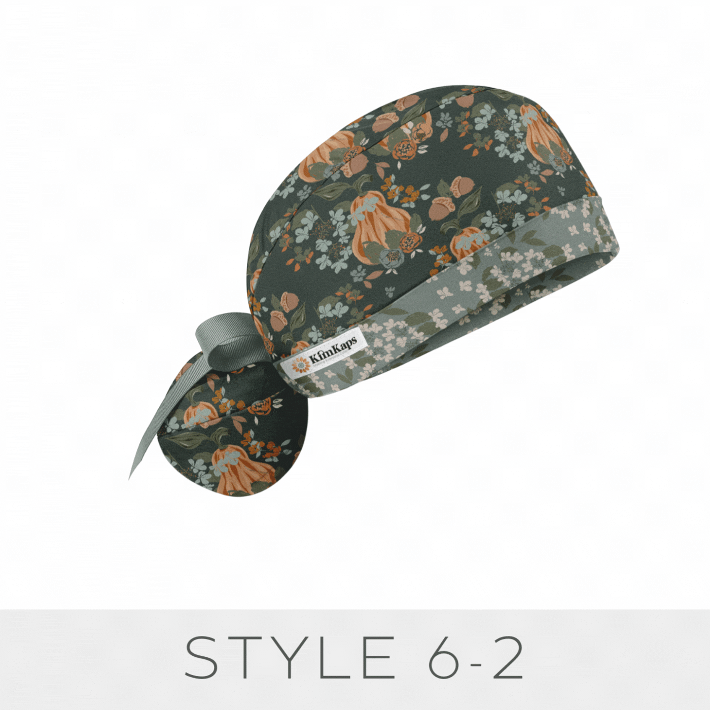 Gorgeous gourds, acorns, and fall florals in beautiful peaches, sages, and minty blues make for a perfect Thanksgiving and fall scrub cap! We added a gorgeous floral coordinate, and mint ribbons for Style 6 and style 10.