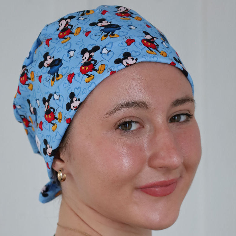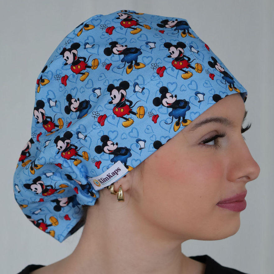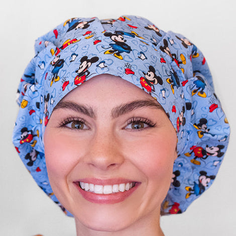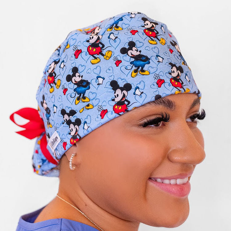 Classic Mickey Mouse and Minnie Mouse make the cutest club ever, on the cutest scrub cap! Red ribbons for Style 6 and Style 10 add the perfect touch. Available in bouffant, tieback, European, unisex, and ponytail scrub hat styles. Exclusive to KimKaps!