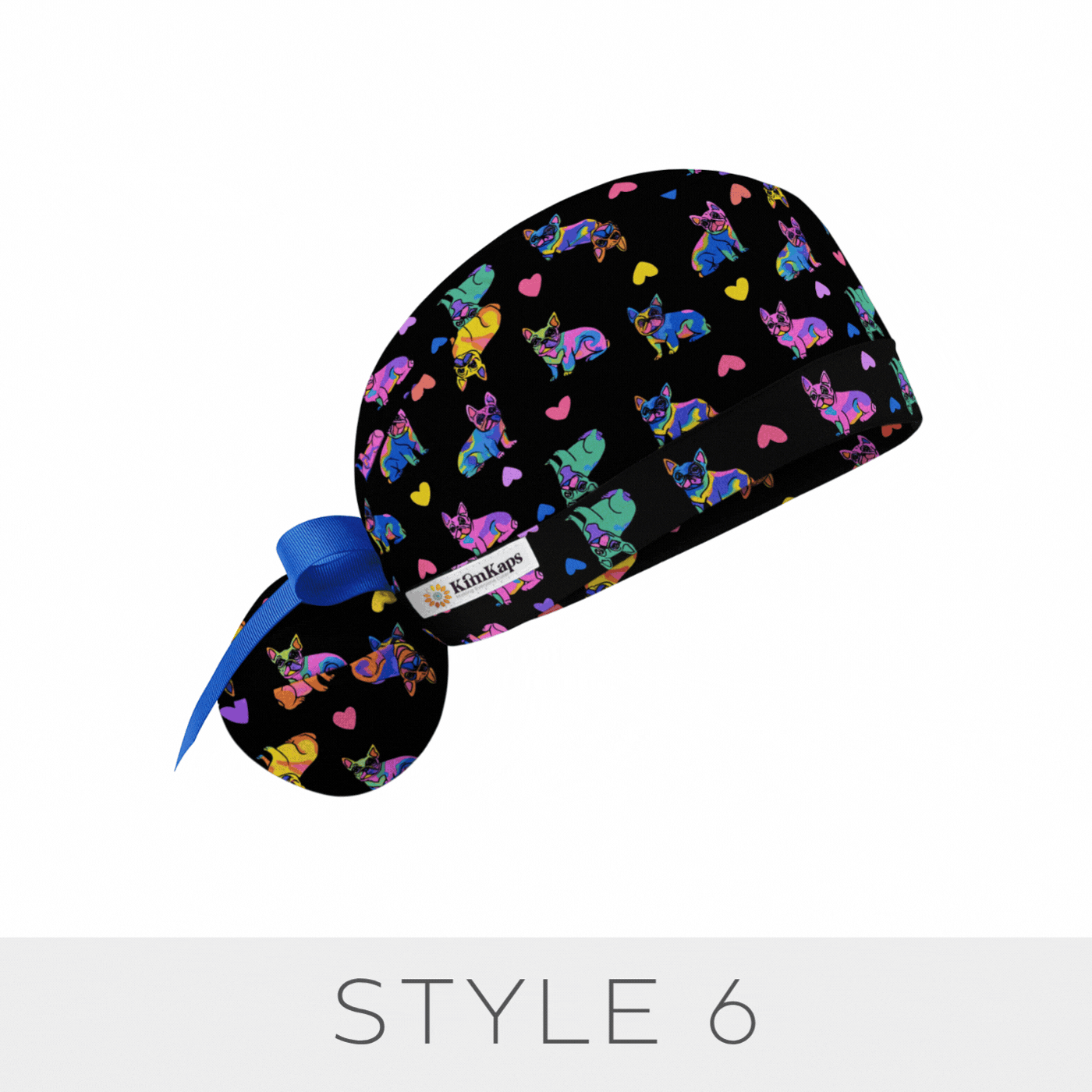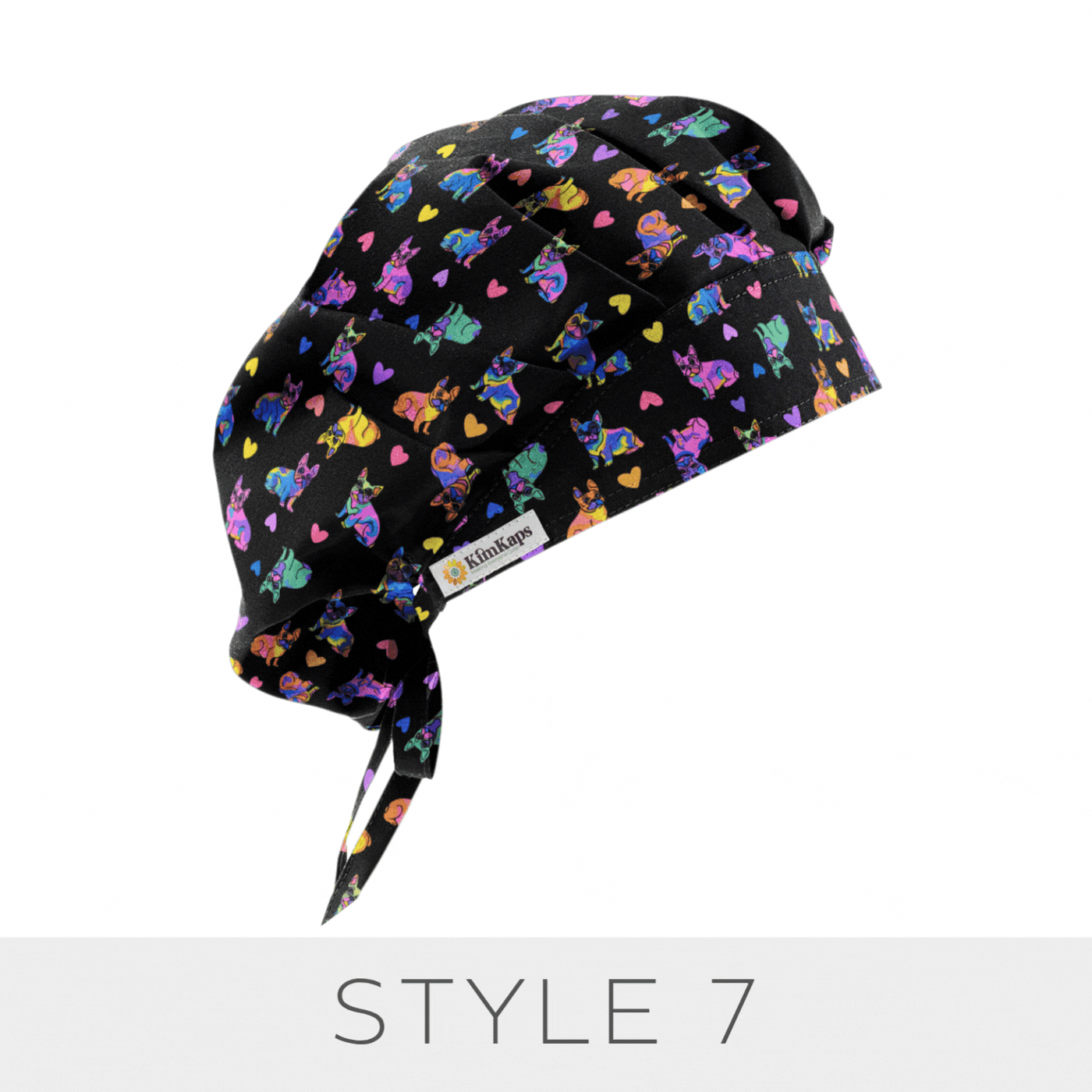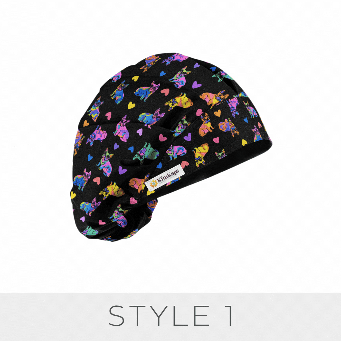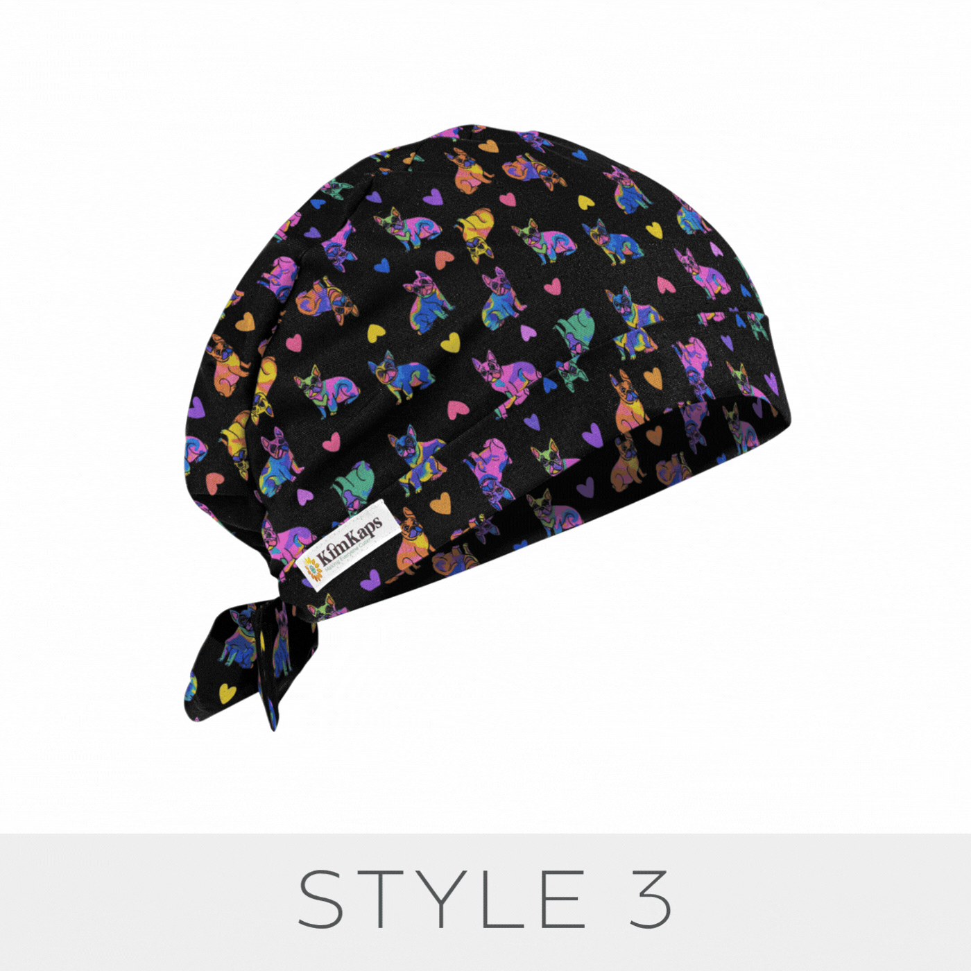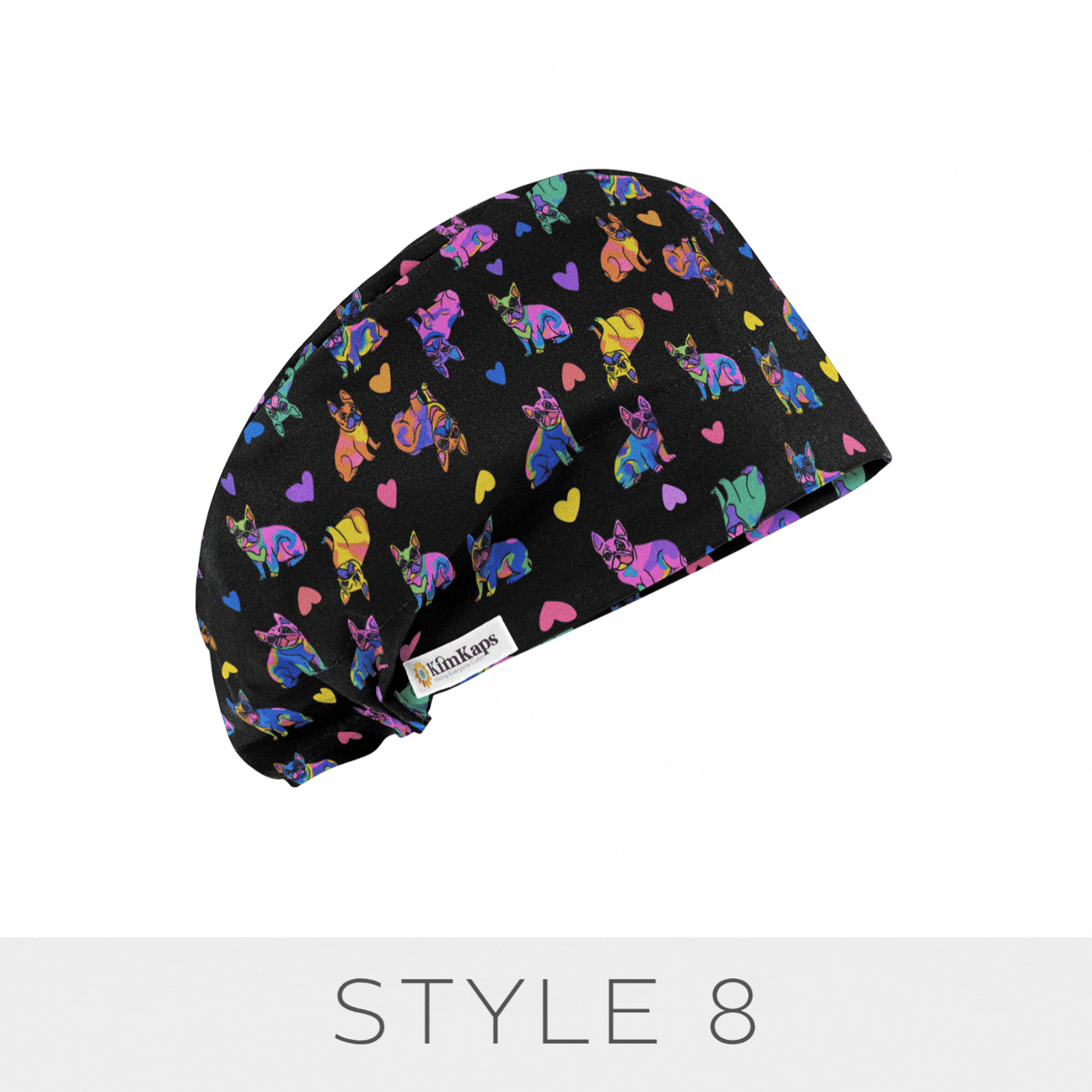 Color Me Frenchie is bursting with big personality and even bigger charm. Featuring vibrant, rainbow-hued French bulldogs on a bold black background, scrub cap with dogs is all about confidence, color, and fun. Scattered hearts add an extra dose of love, because Frenchies don’t do anything halfway.