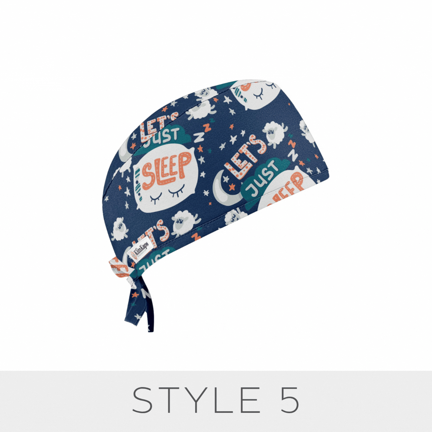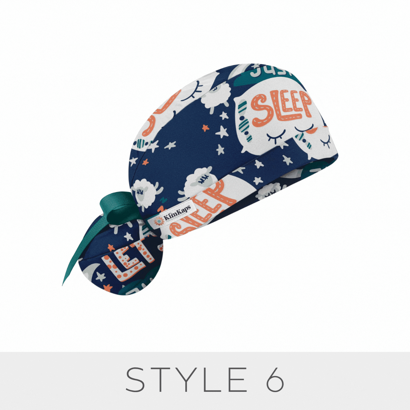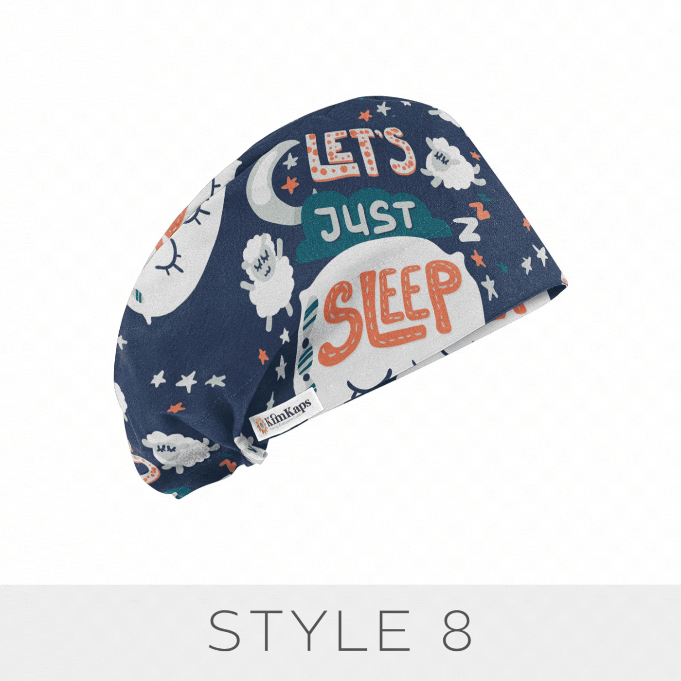 A KimKaps exclusive! Whether you're an anesthesia professional or any standard sleep-deprived medical professional, this cute surgical scrub cap will speak to you: Let's Just Sleep! Sleepy themes like eyes, pillows, sheep, and moons are perfect, and teal green ribbons tie your ponytail for Style 6. Are you yawning yet?