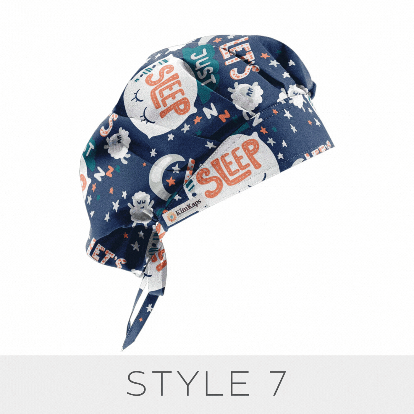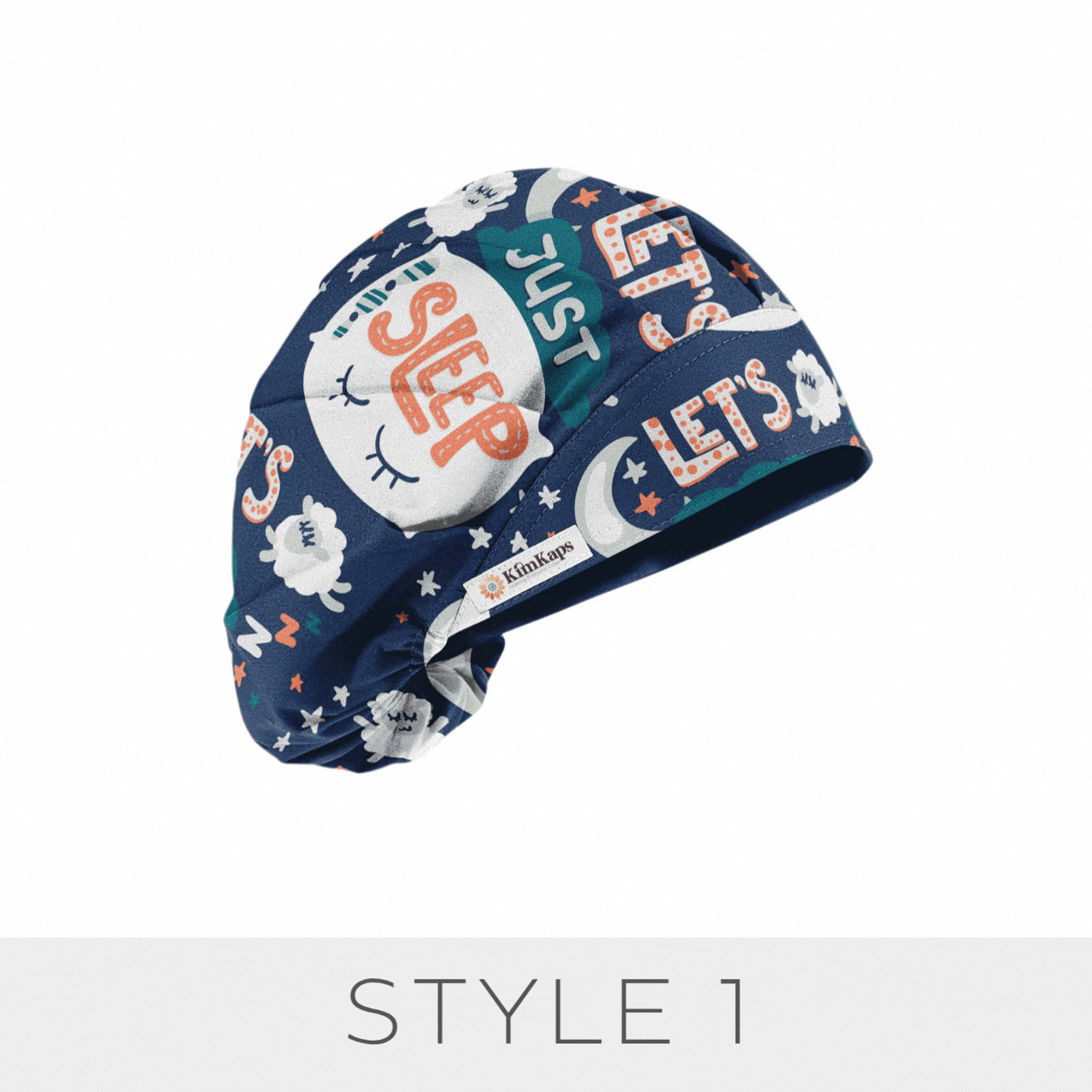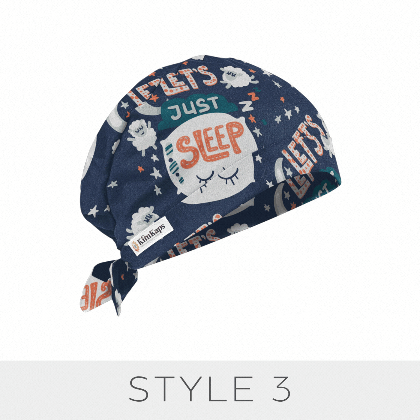 A KimKaps exclusive! Whether you're an anesthesia professional or any standard sleep-deprived medical professional, this cute surgical scrub cap will speak to you: Let's Just Sleep! Sleepy themes like eyes, pillows, sheep, and moons are perfect, and teal green ribbons tie your ponytail for Style 6. Are you yawning yet?