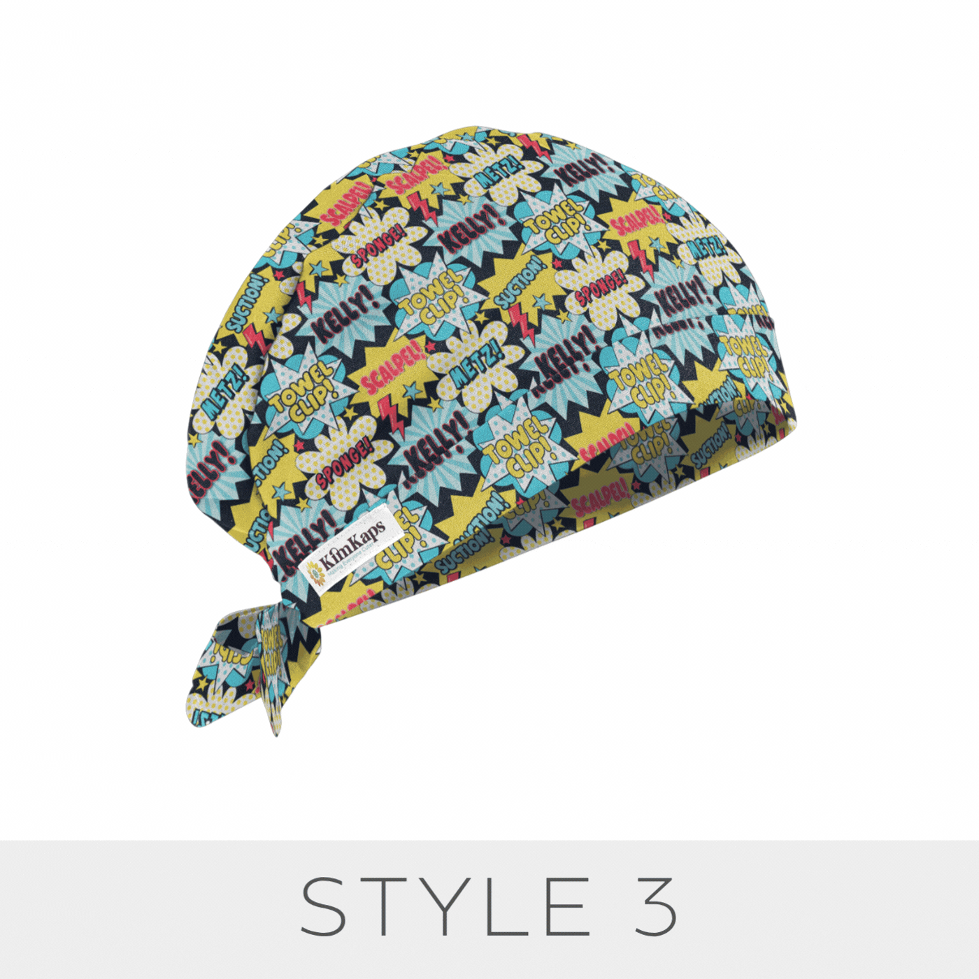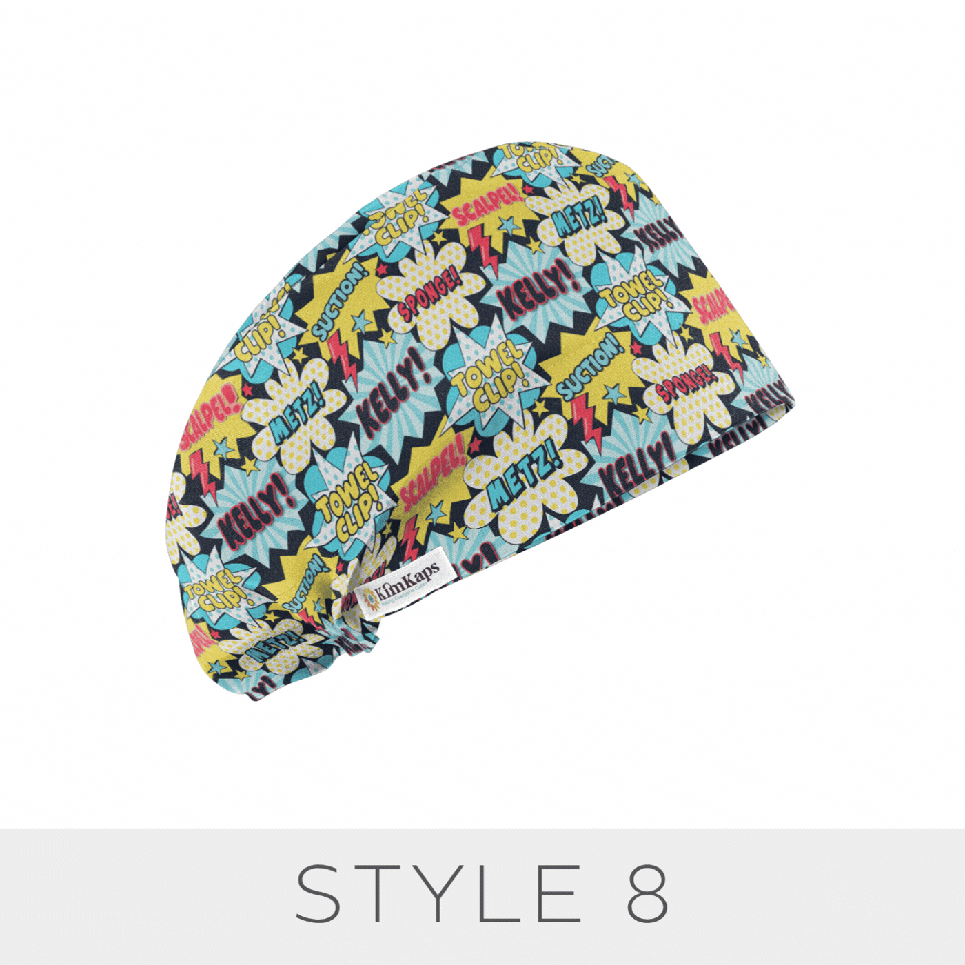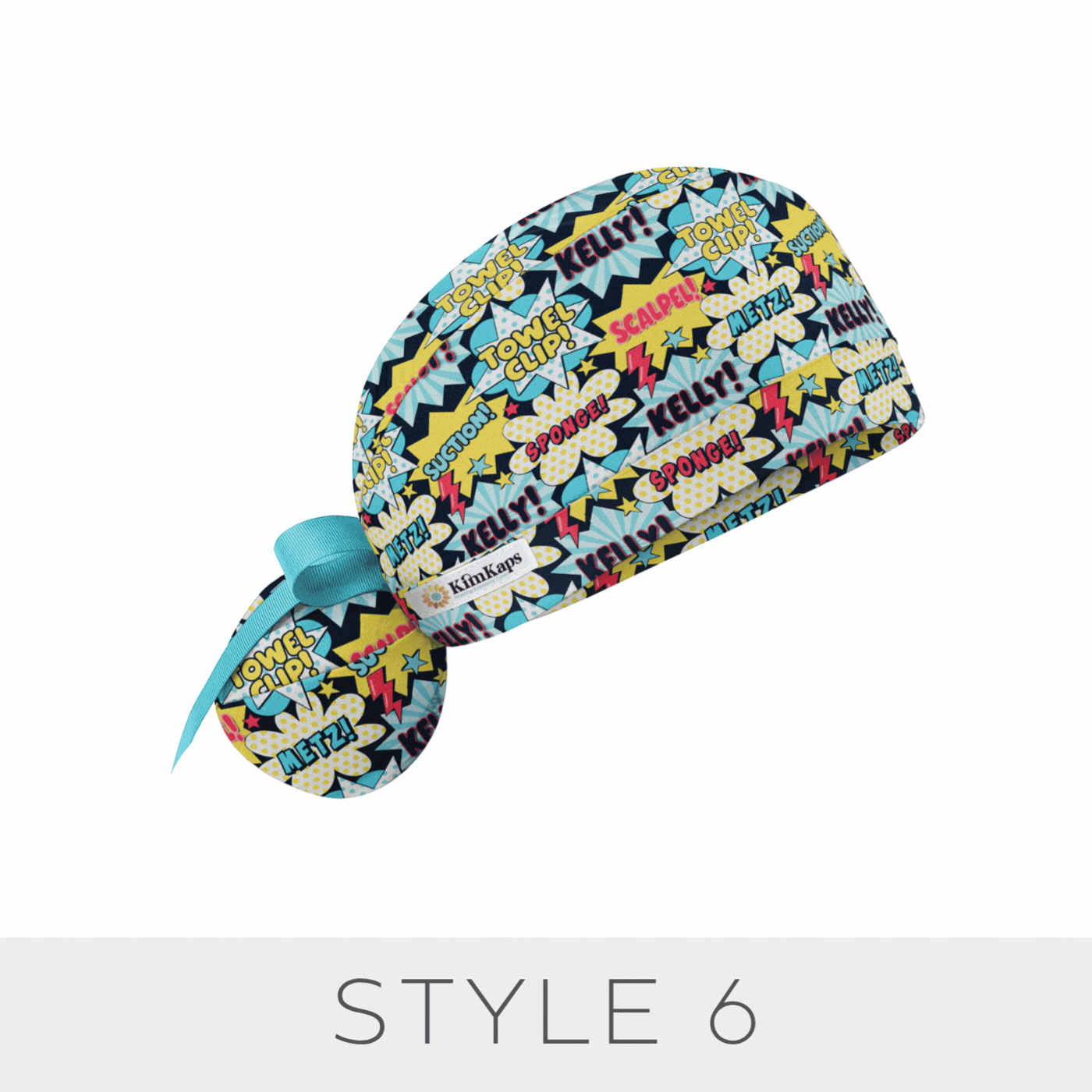 You're ever our heroes at the surgical curtain! And anywhere else our superhero medical professionals use their skills to keep everyone healthy. We love this exclusive comic book inspired scrub hat, and we think you will, too! We added turquoise ribbons for Style 6. Look for it in bouffant, tieback, European, unisex, and ponytail scrub hat styles.