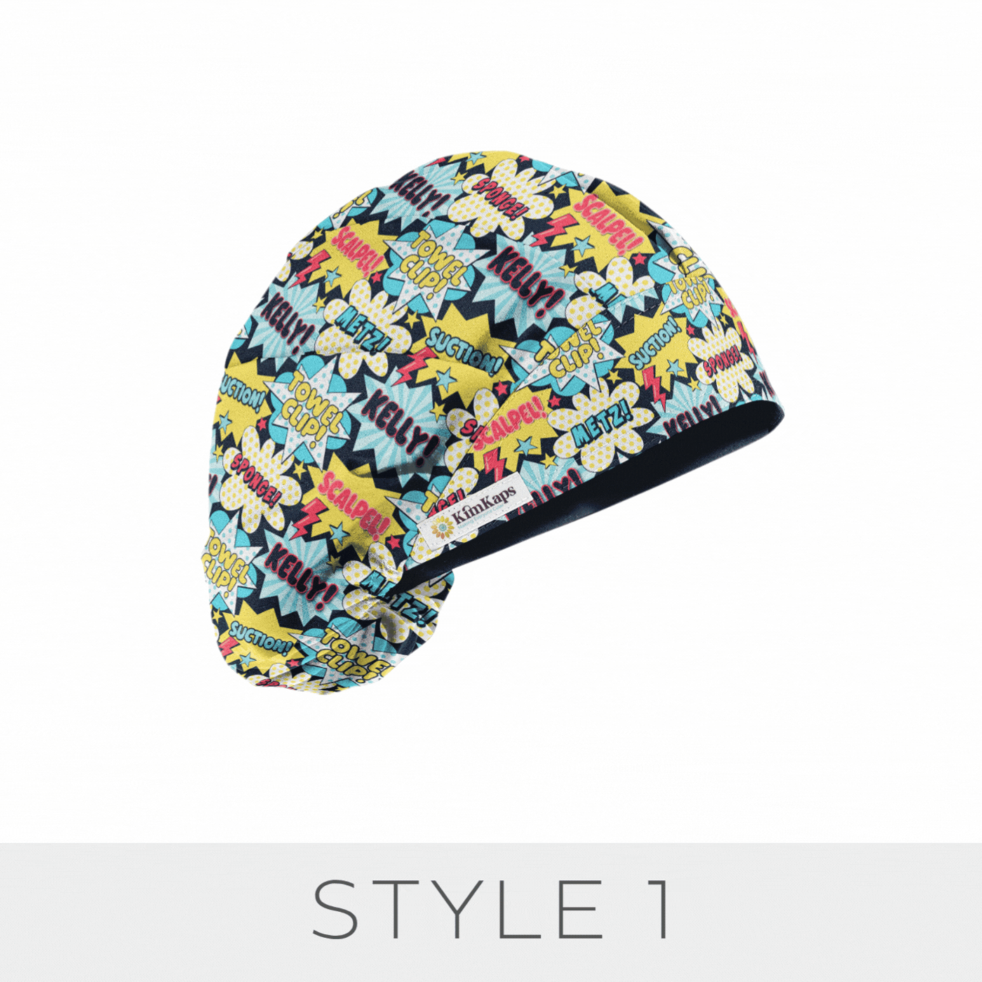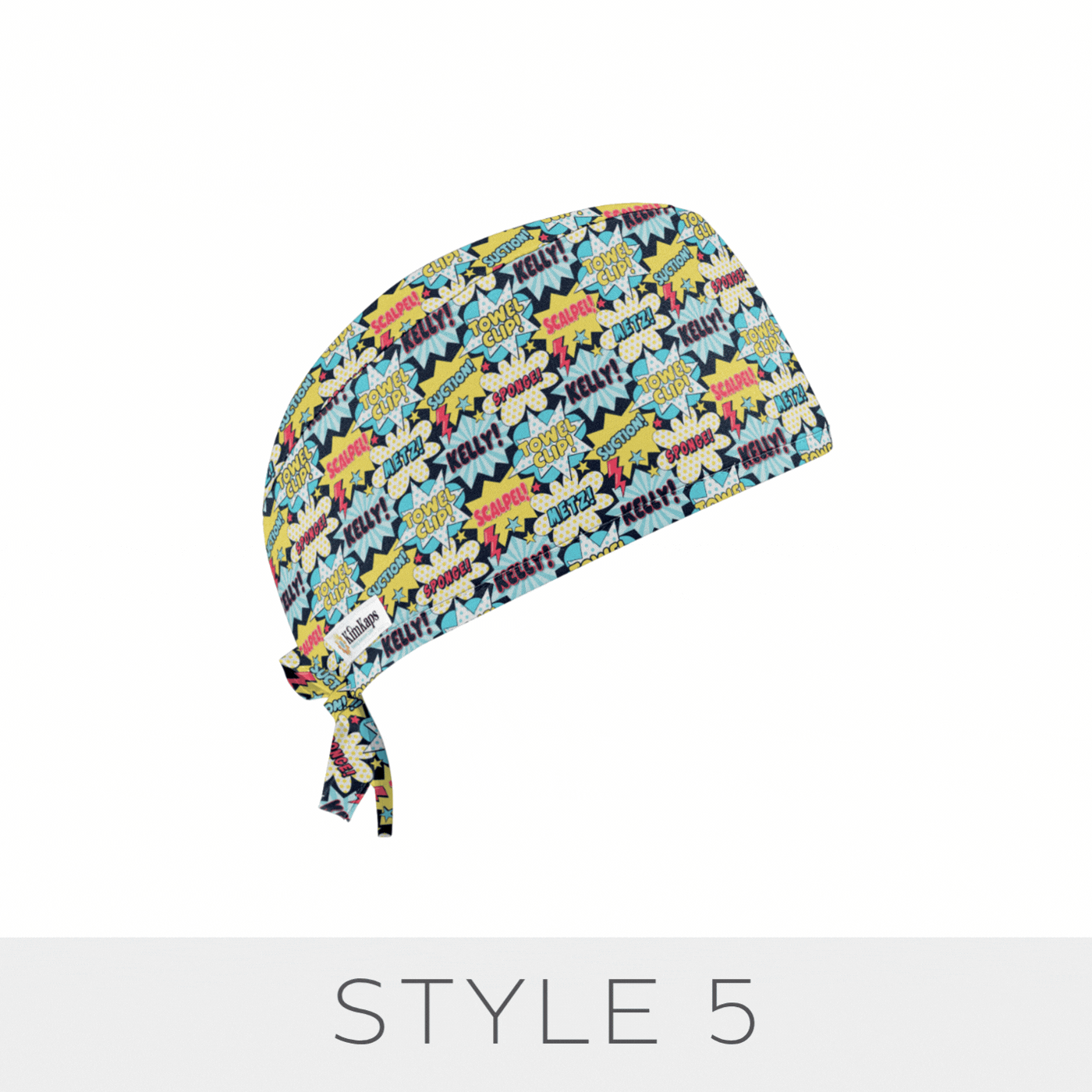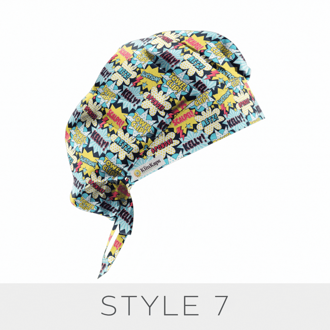 You're ever our heroes at the surgical curtain! And anywhere else our superhero medical professionals use their skills to keep everyone healthy. We love this exclusive comic book inspired scrub hat, and we think you will, too! We added turquoise ribbons for Style 6. Look for it in bouffant, tieback, European, unisex, and ponytail scrub hat styles.