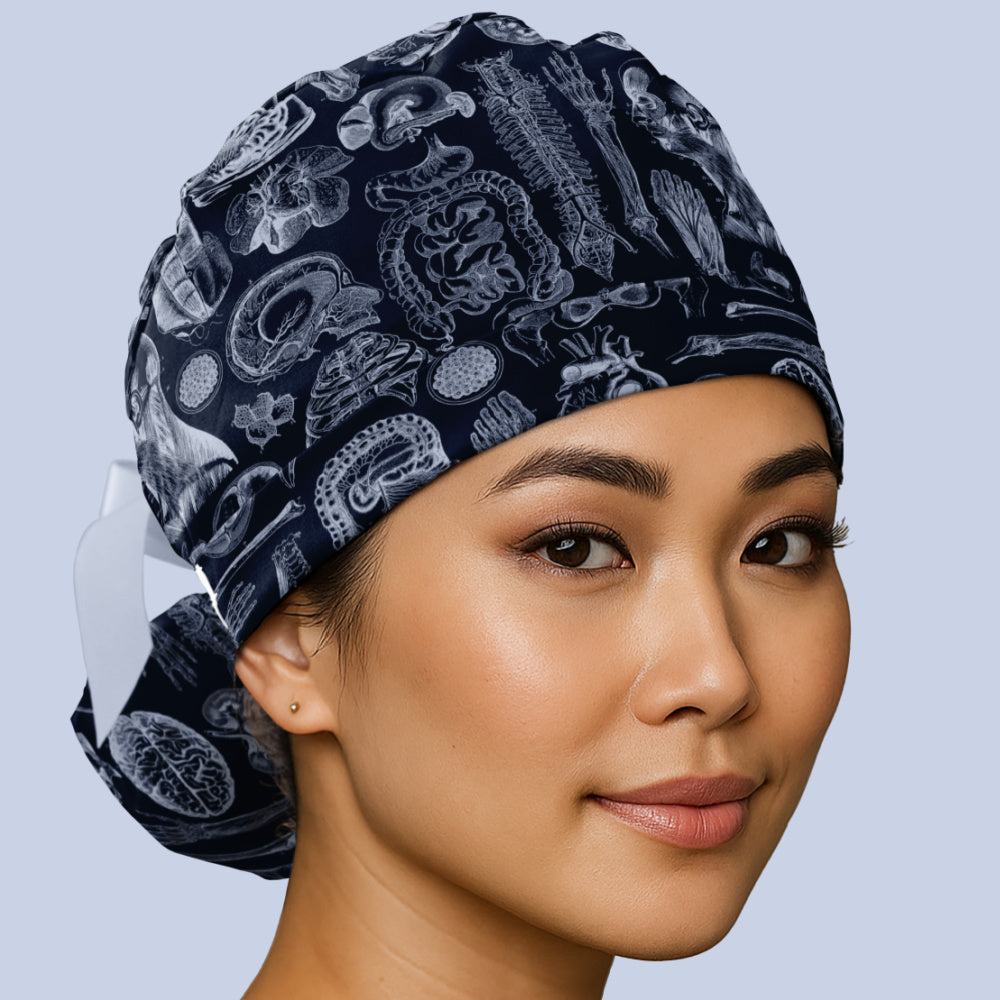 These exclusive anatomy scrub caps are made in the USA of 100% cotton, and are designed to keep you cute and comfortable all shift long.