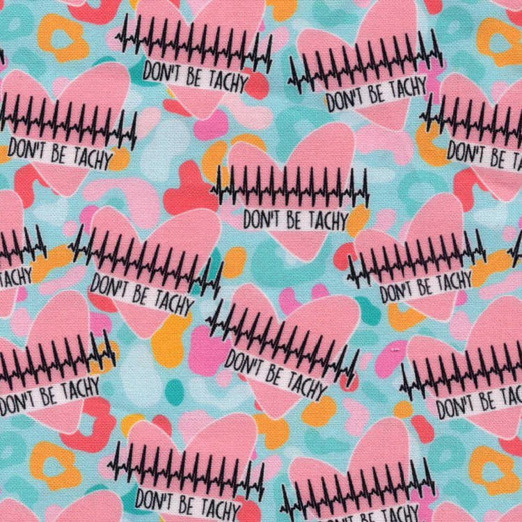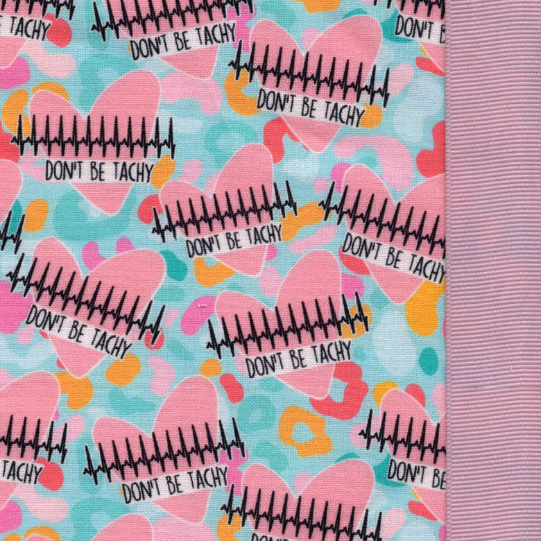 This surgical scrub cap with hearts and QRS tells everyone: Don't Be Tachy! We added pink ribbons for Style 6. Available in bouffant, tieback, European, unisex, and ponytail scrub hat styles. Exclusive to KimKaps!