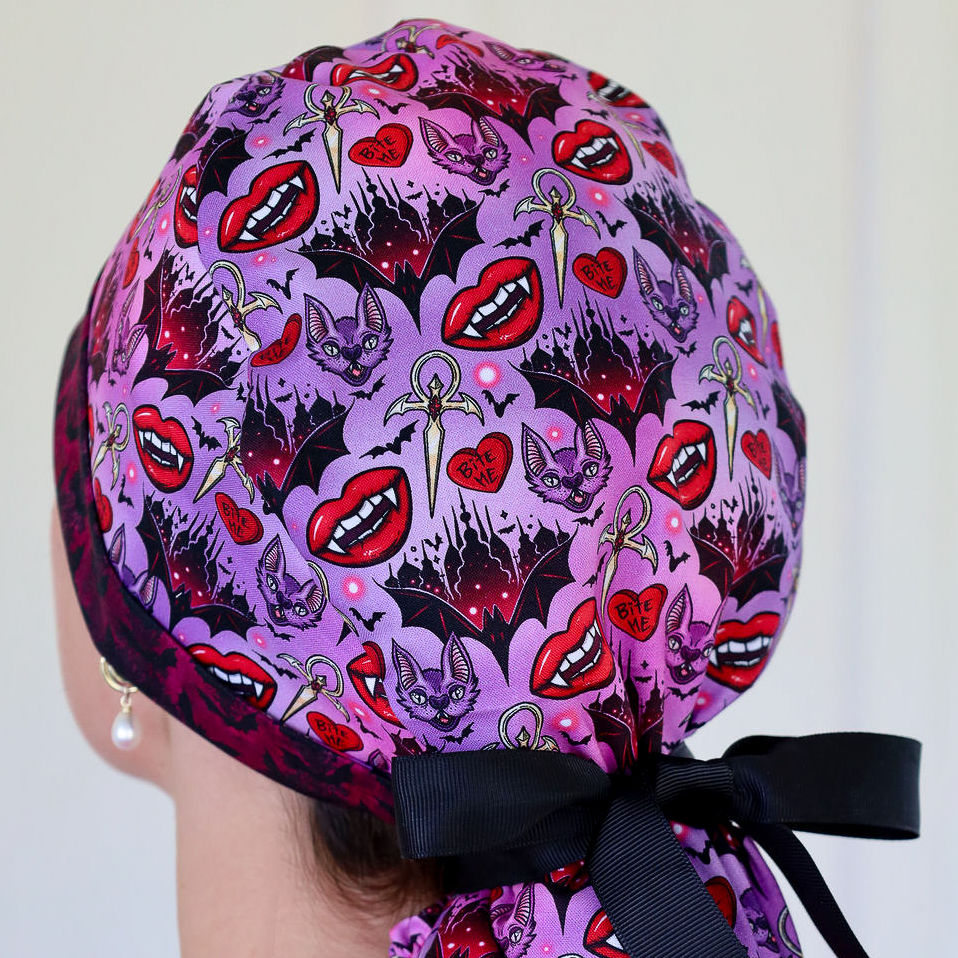 These Halloween vampire scrub hats are made in the USA of 100% cotton, and are designed to keep you cute and comfortable all shift long.