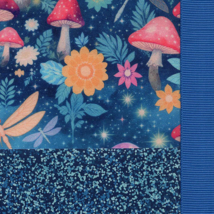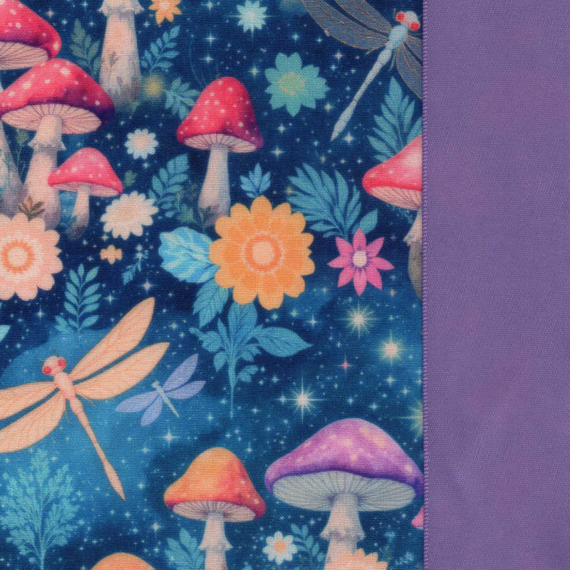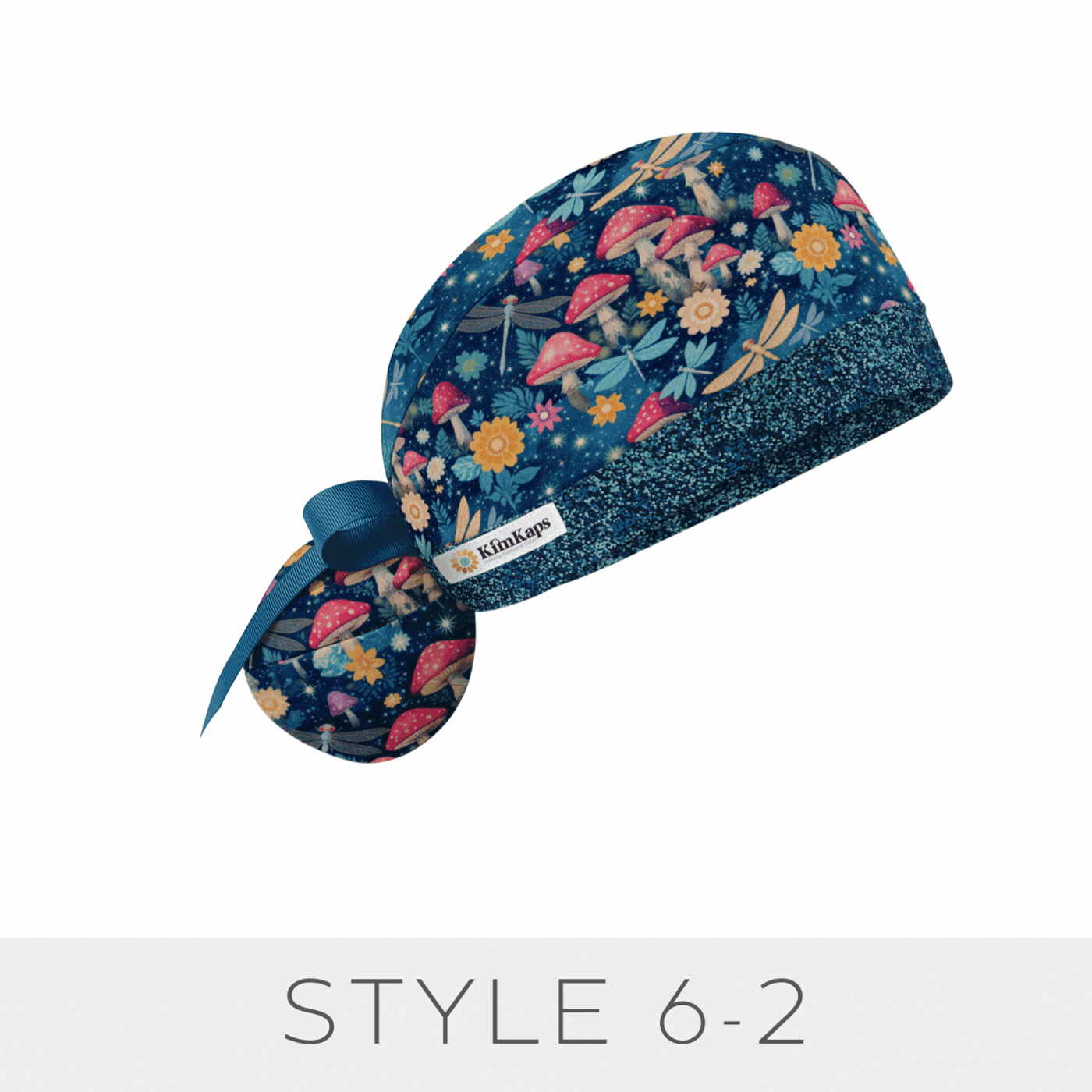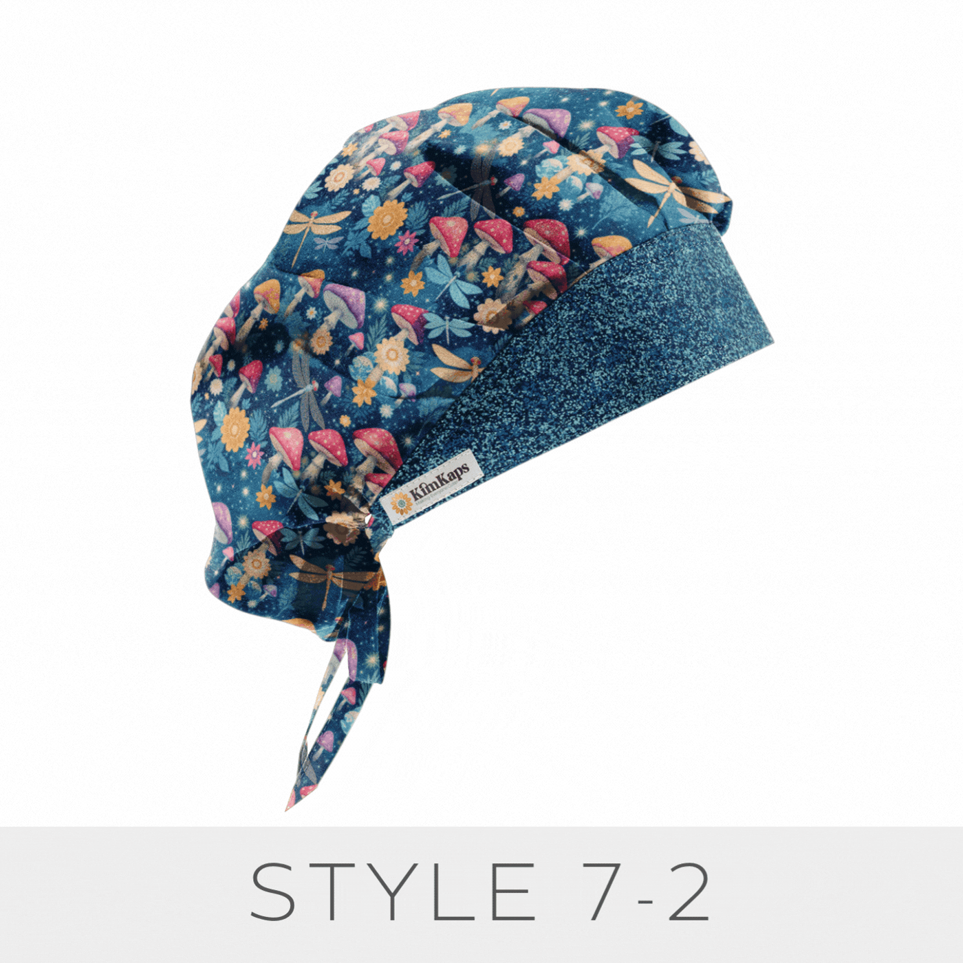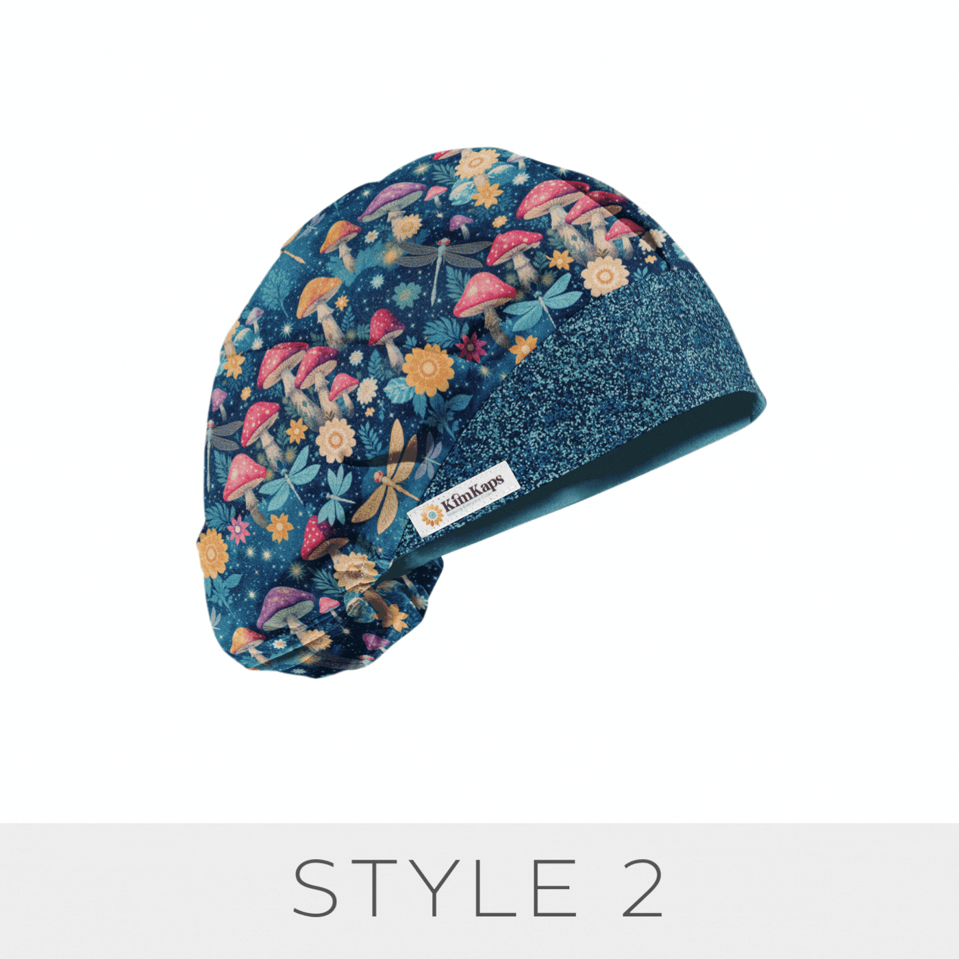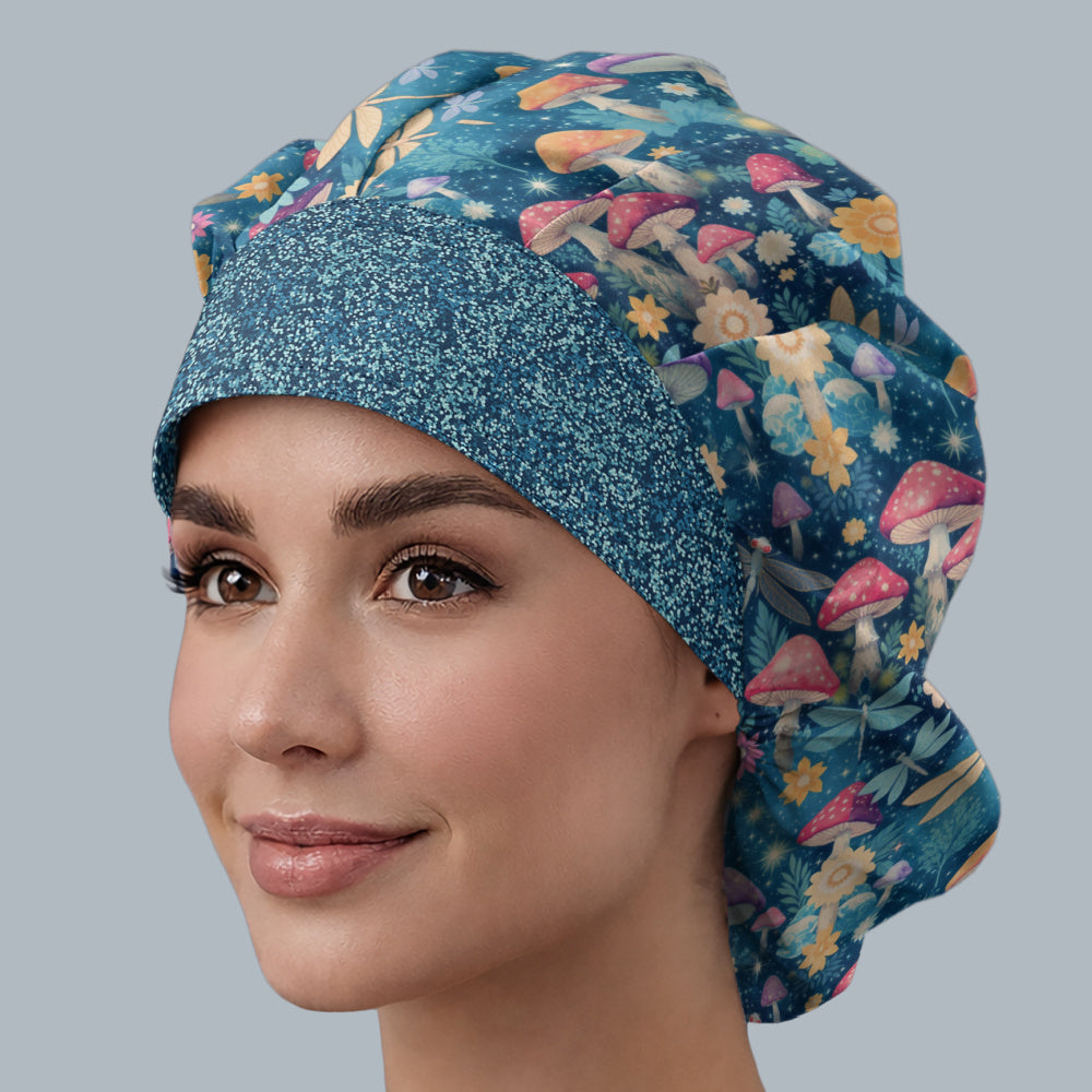This fun scrub cap with mushrooms, dragonflies, stars, and flowers feels like a moonlit meadow touched by magic, where tiny wonders come to life.