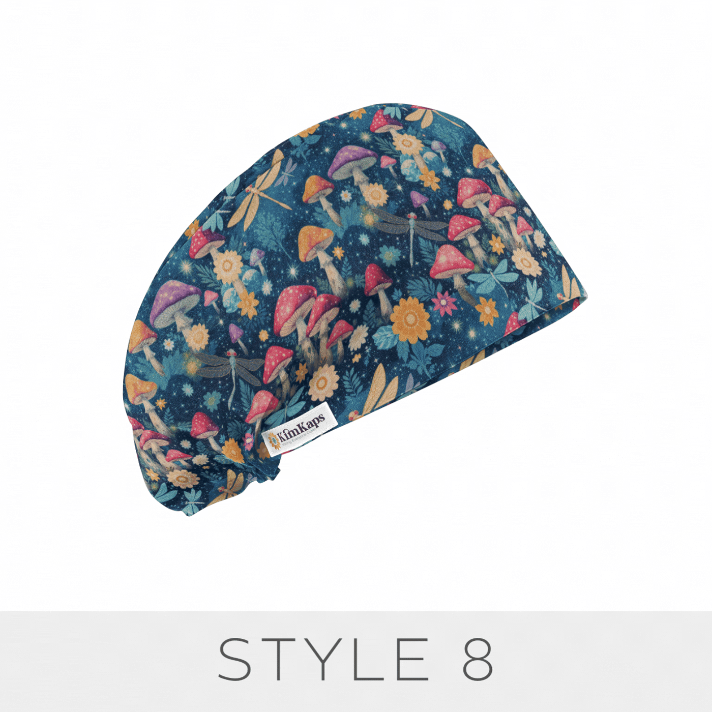 These scrub caps with dragonflies and mushrooms are made in the USA of 100% cotton, and are designed to keep you cute and comfortable all shift long.