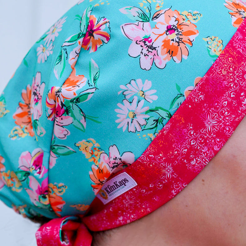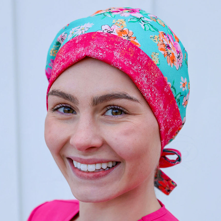 The goddess of the earth herself would love wearing this gorgeous floral scrub cap! We added a hot pink coordinate and hot pink ribbons for your ponytail in Style 6-2, and hot pink for Style 10's bow.