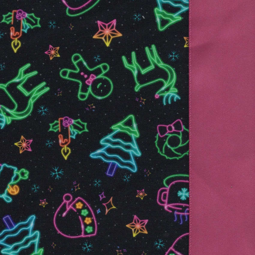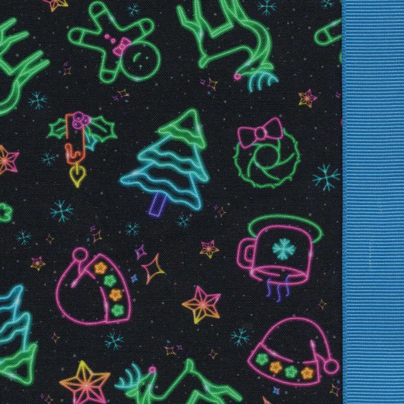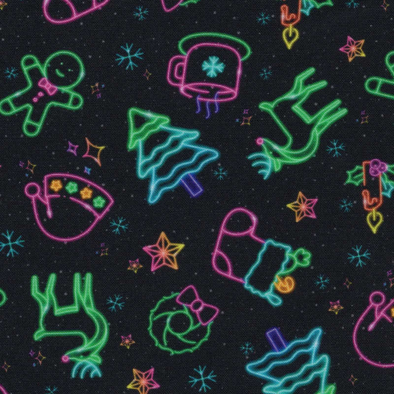 Light up the holiday hustle with Glow Season! This festive favorite features neon-style rainbow trees, wreaths, stockings, cocoa mugs, stars, and snowflakes that shine bright against a black background.