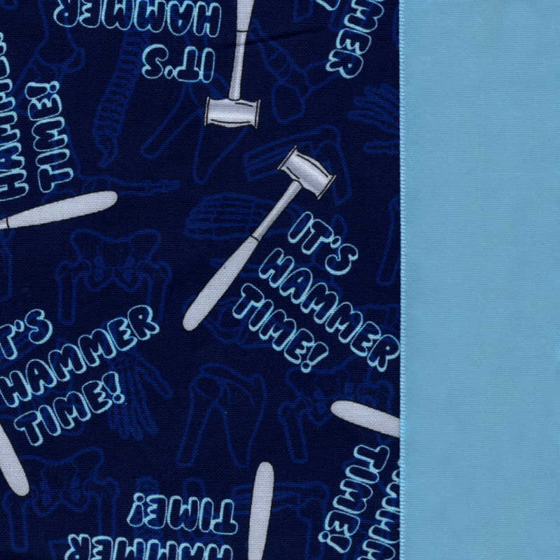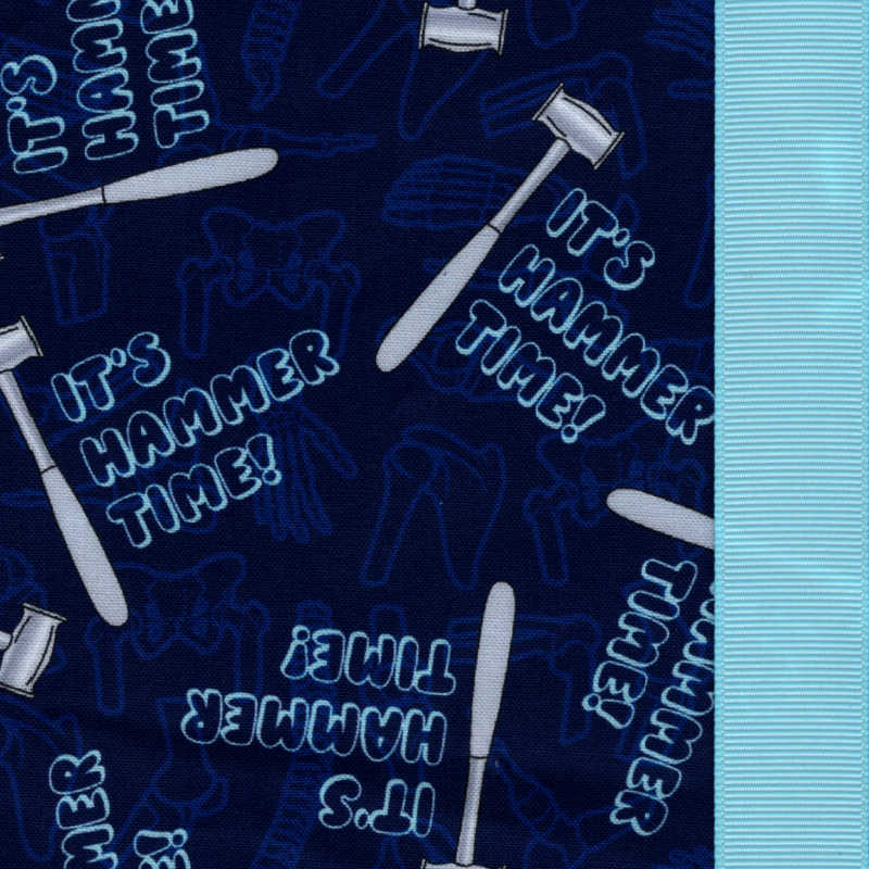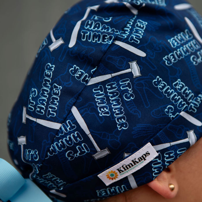 This hilarious scrub cap for Orthopedics declares, "It's Hammer Time!" We added light blue ribbons to dress up Style 6 and Style 10, and it is available in bouffant, tieback, European, unisex, and ponytail scrub hat styles. Exclusive to KimKaps!