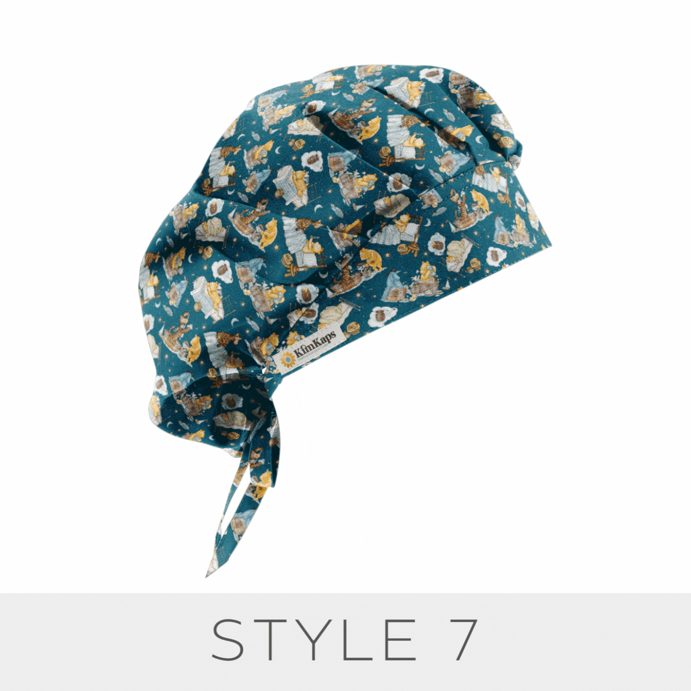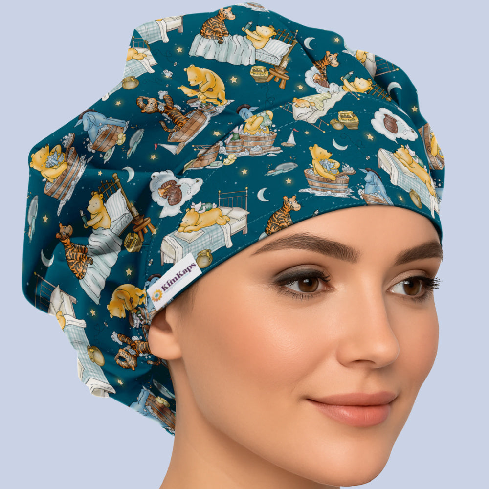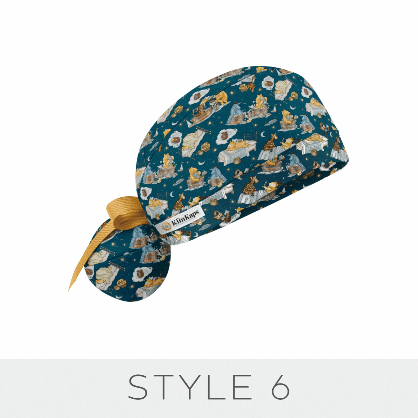 Adorable classic Pooh, Tigger, Piglet, and Eeyore are doing their bedtime routines--perfect scrub cap for anesthesia professionals! We added yellow ribbons to Style 6.