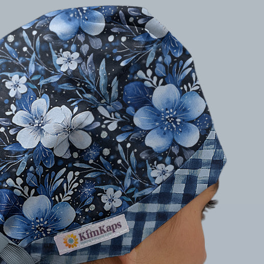 Our Indigo Cottage cap feels like a winter weekend tucked under a quilt — warm, comfy, and a little bit country-chic. With deep blue florals and a sweet gingham touch, it’s giving cottagecore meets coffee break, all wrapped up in scrub-cap form.
