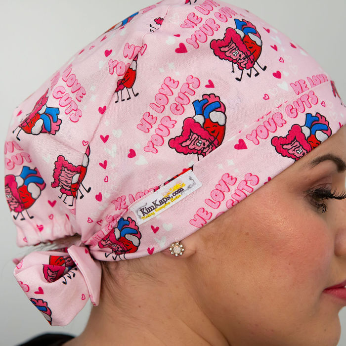 This darling scrub hat for gastro, endo, and other gut specialties will LOVE this "Love Your Guts" cap featuring hearts putting the love-squish on some intestines! Style 6 gets red ribbons for your ponytail, and Style 10 gets a hot pink ribbon. You'll only find it at KimKaps!