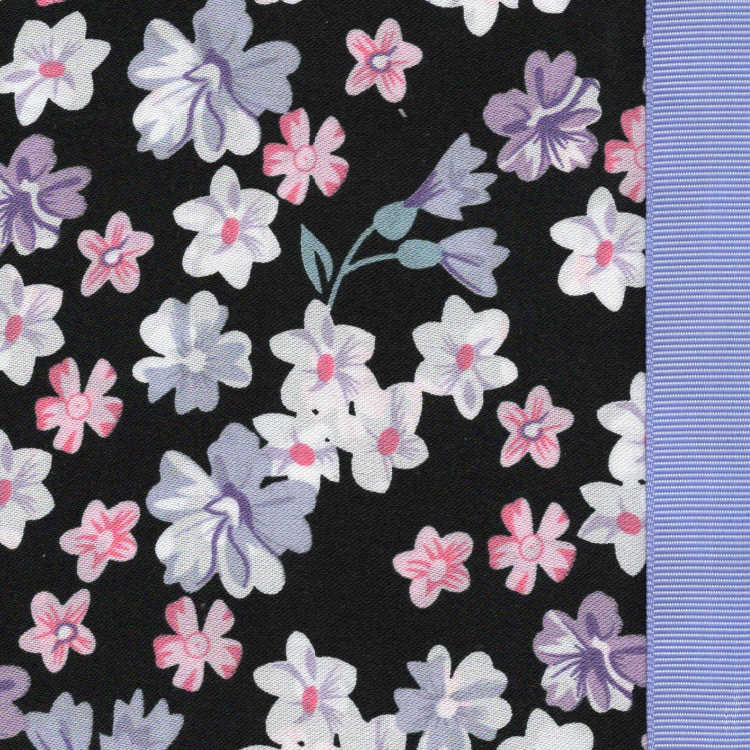 Only in our satin fabric! Sweet florals on a black background, available while they last in Satin Style 1, Satin Style 6 (with a periwinkle ribbon) and Satin Style 8. A KimKaps exclusive!