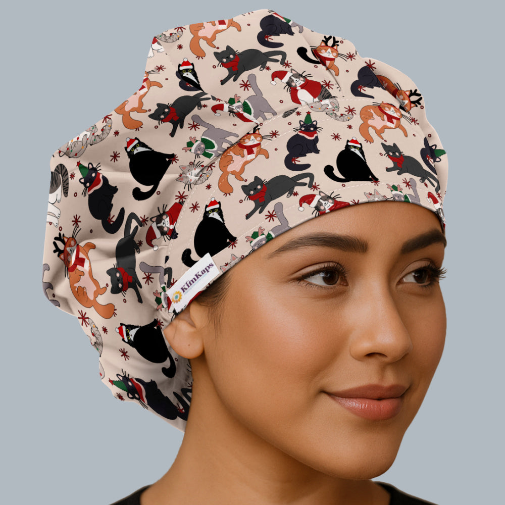 These exclusive kitty Christmas scrub caps are made in the USA of 100% cotton, and are designed to keep you cute and comfortable all shift long.