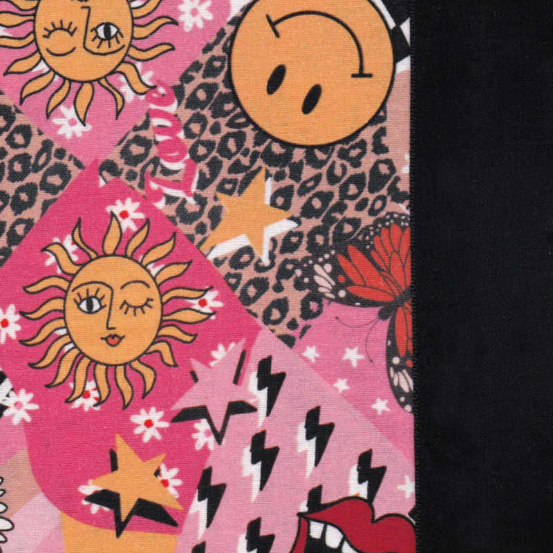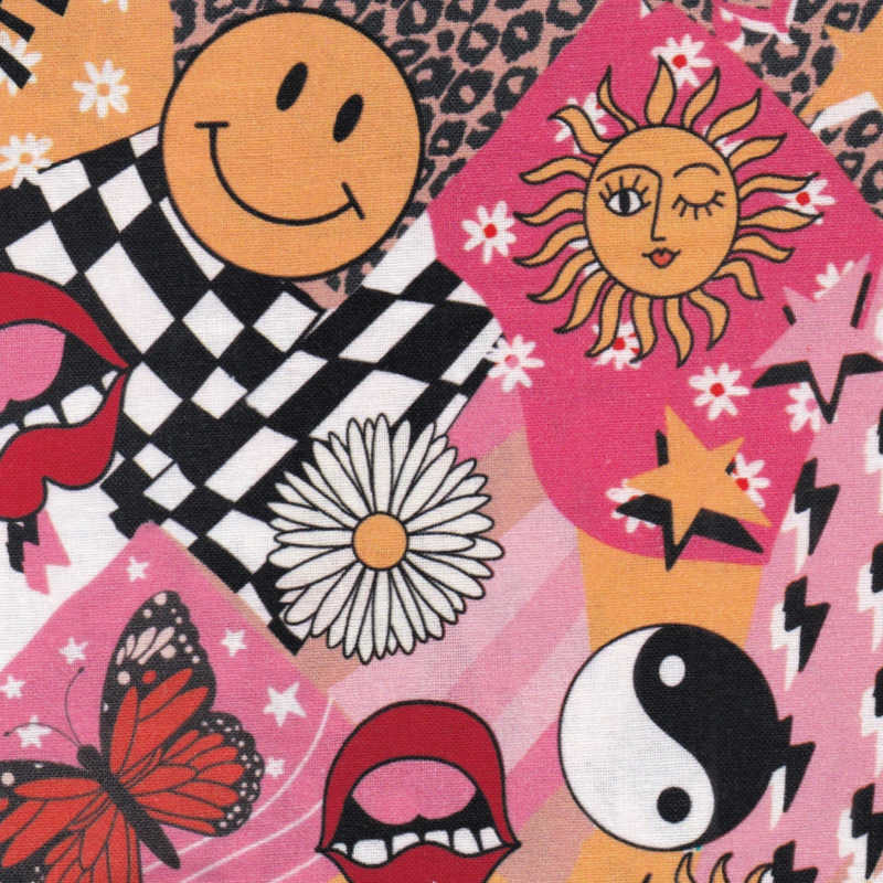Bold, playful, and bursting with personality, Phenomenon is a full-on vibe. This eye-catching print mixes retro pop-art icons—smiley faces, yin yangs, butterflies, lightning bolts, lips, daisies, stars, and suns—layered over punchy pinks, golds, and graphic black-and-white accents. It’s fun, fearless, and impossible to ignore.