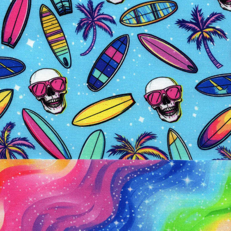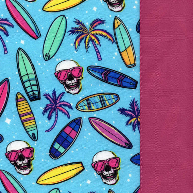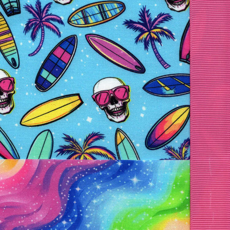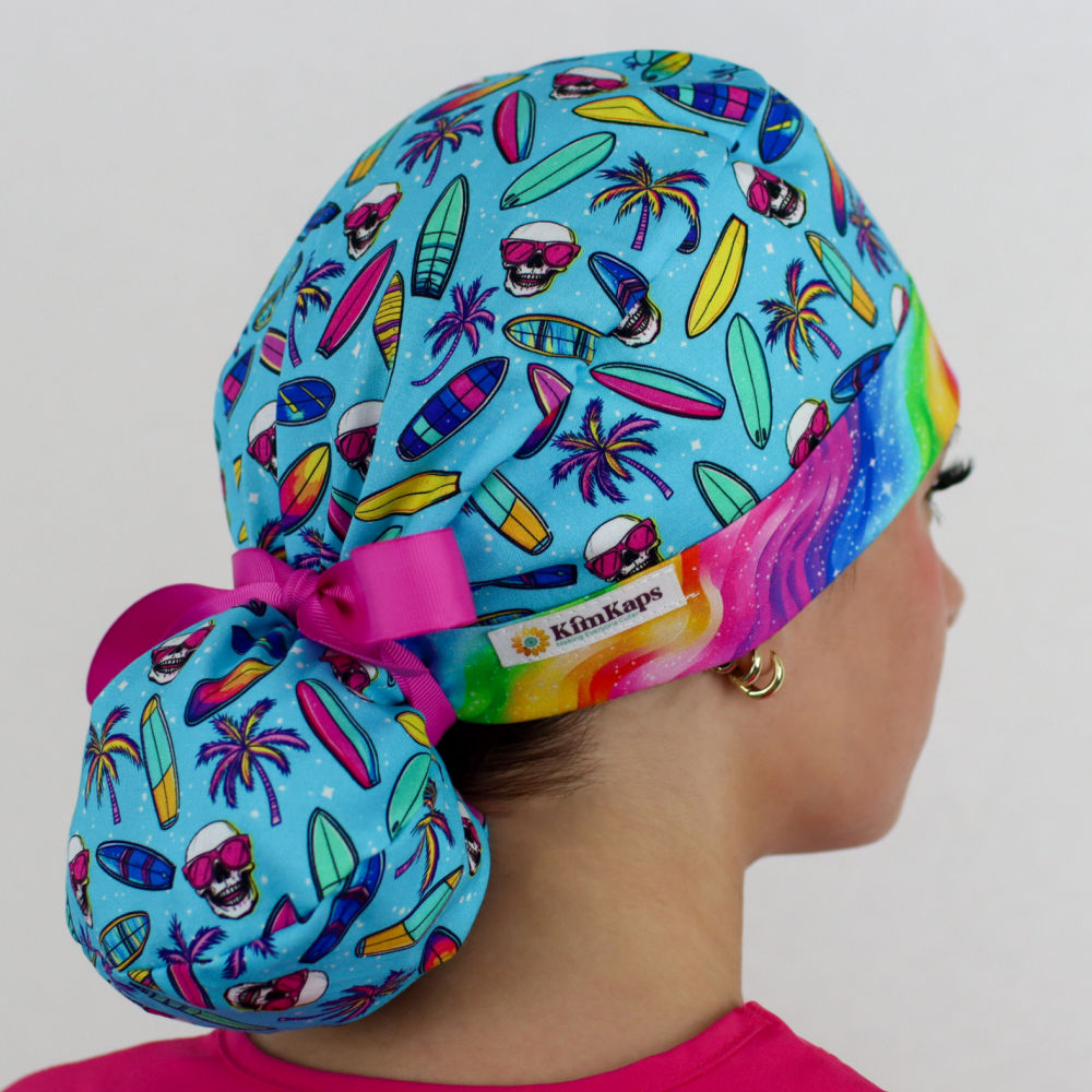 A cute rainbow-surf coordinate is perfect with the surfboards and shade-wearing skulls on this fun scrub cap! We added pink ribbons for Style 6 and Style 10.