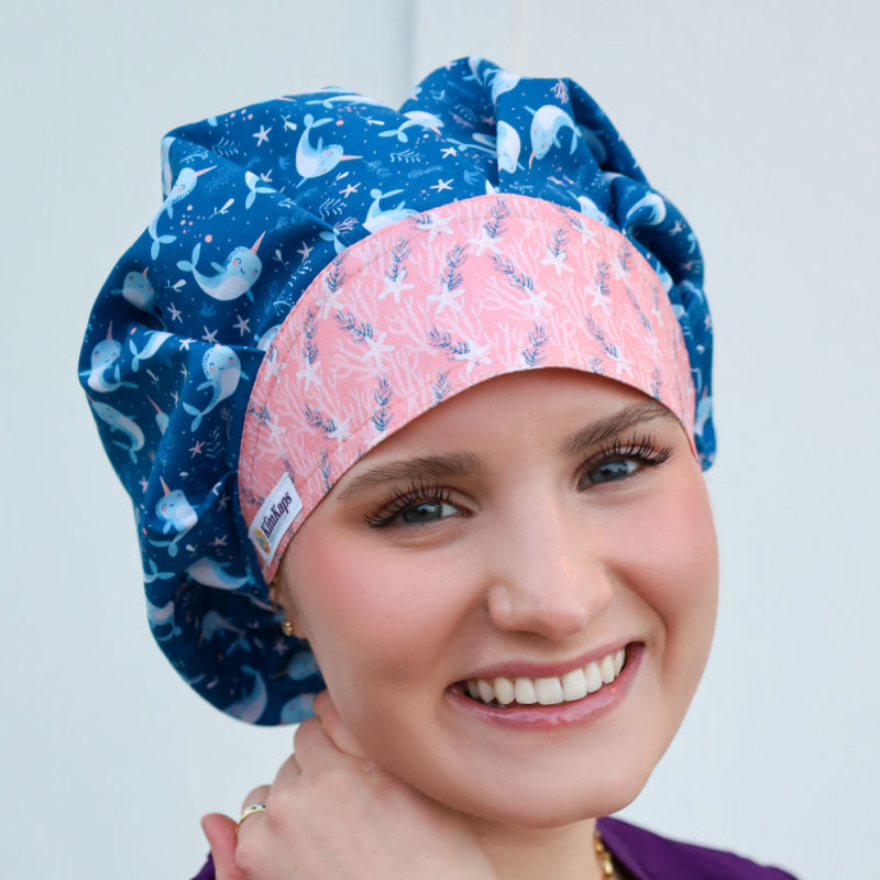 A scrub cap with narwhals is about as rare as a unicorn, so snap these cuties up! We added a fun starfish and coral coordinate, with peach ribbons for Style 6.