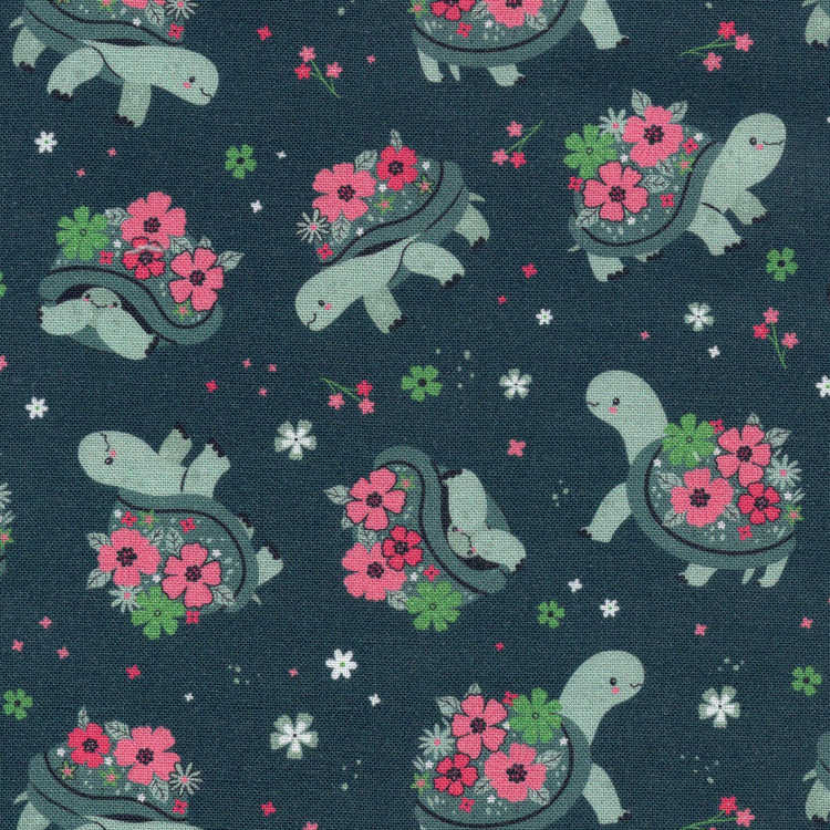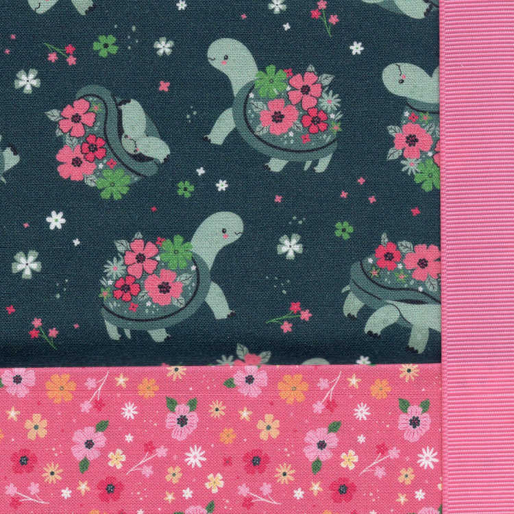 Cute, cheerful, and full of easygoing charm, Shell Yeah features adorable green turtles cruising along on a teal background, each shell blooming with soft pink florals. The coordinating pink floral brings everything together for a look that feels happy, calm, and just plain fun.