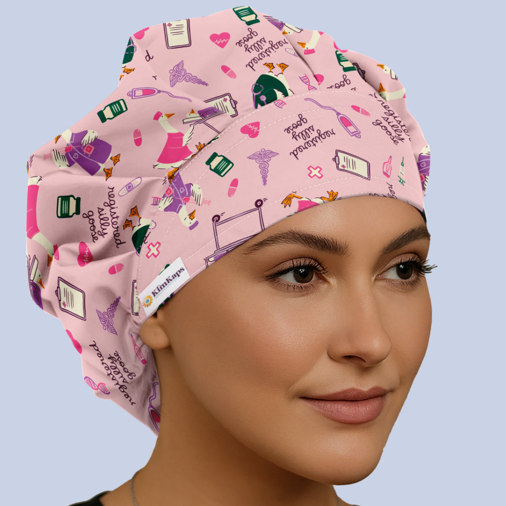 Meet the cap that quacks you up and shows you mean business: Silly Goose, RN. Feathered in goofy geese rocking nurse gear, plus bandaids, syringes, charts, thermometers, saline bags, and gurneys, this cap brings pure chaotic hospital energy—in the best way.