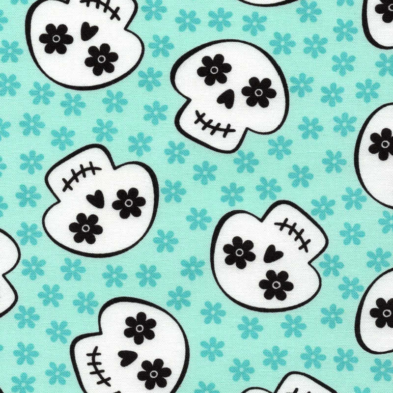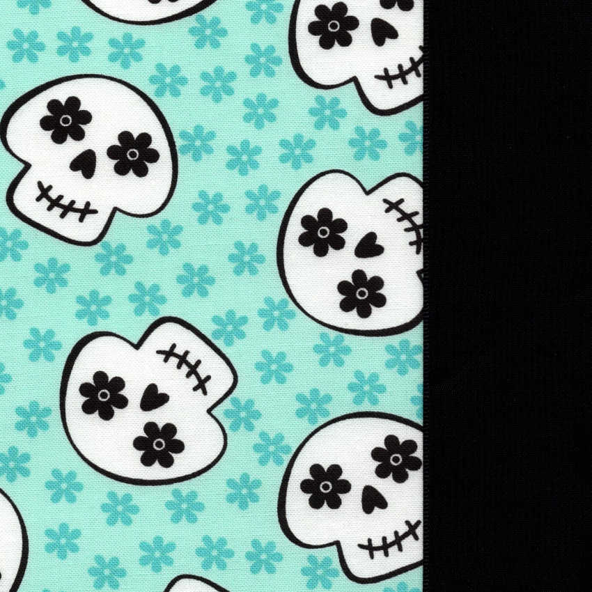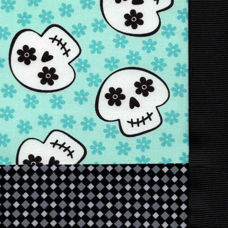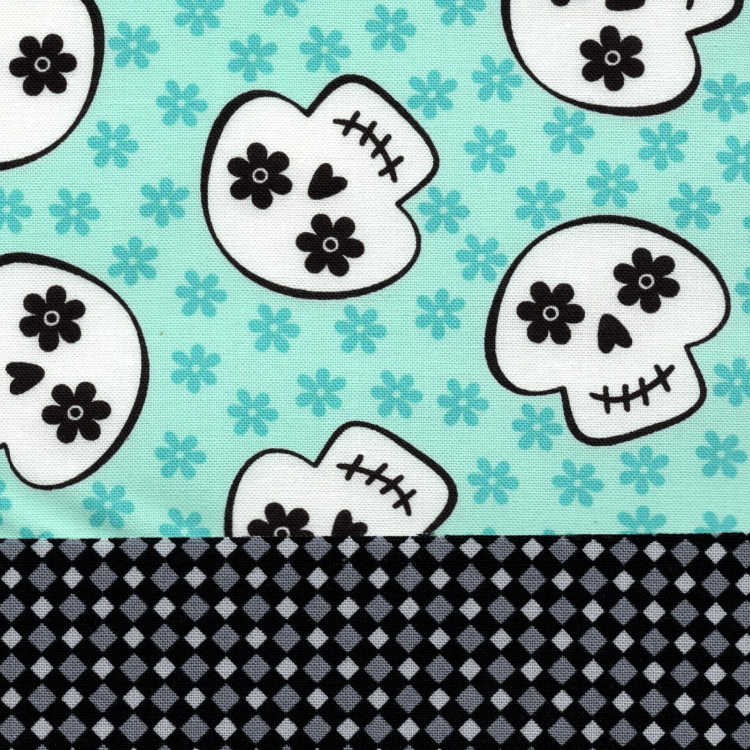 Cutie skulls and turquoise daisies are paired with a fun black and gray checked coordinate. We added black ribbons for Style 6 and 10. So adorable!