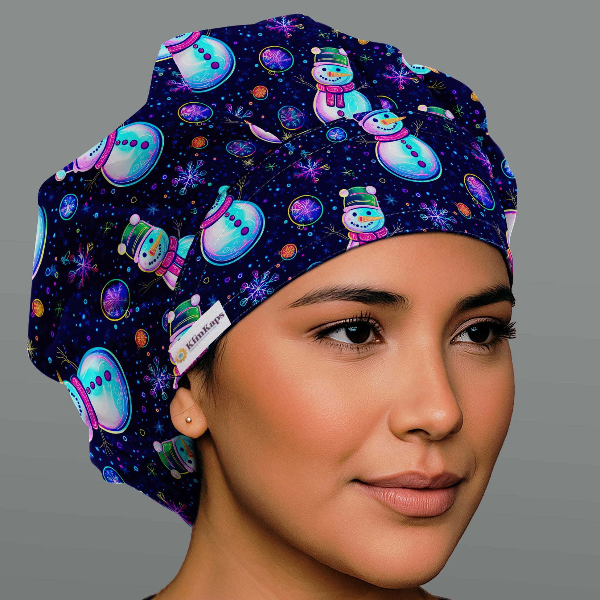 These snowman scrub caps are made in the USA of 100% cotton, and are designed to keep you cute and comfortable all shift long.