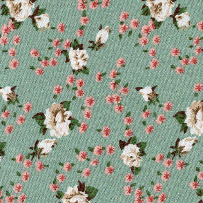 Only in our satin fabric! Tiny pink and white florals on a soothing dusky blue-green background, available while they last in Satin Style 1, Satin Style 6 (with a pink ribbon) and Satin Style 8. A KimKaps exclusive!