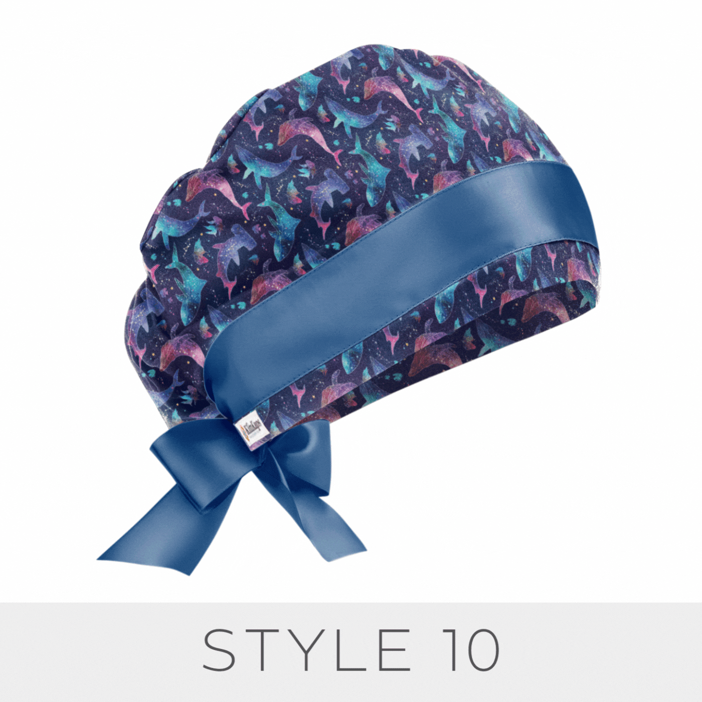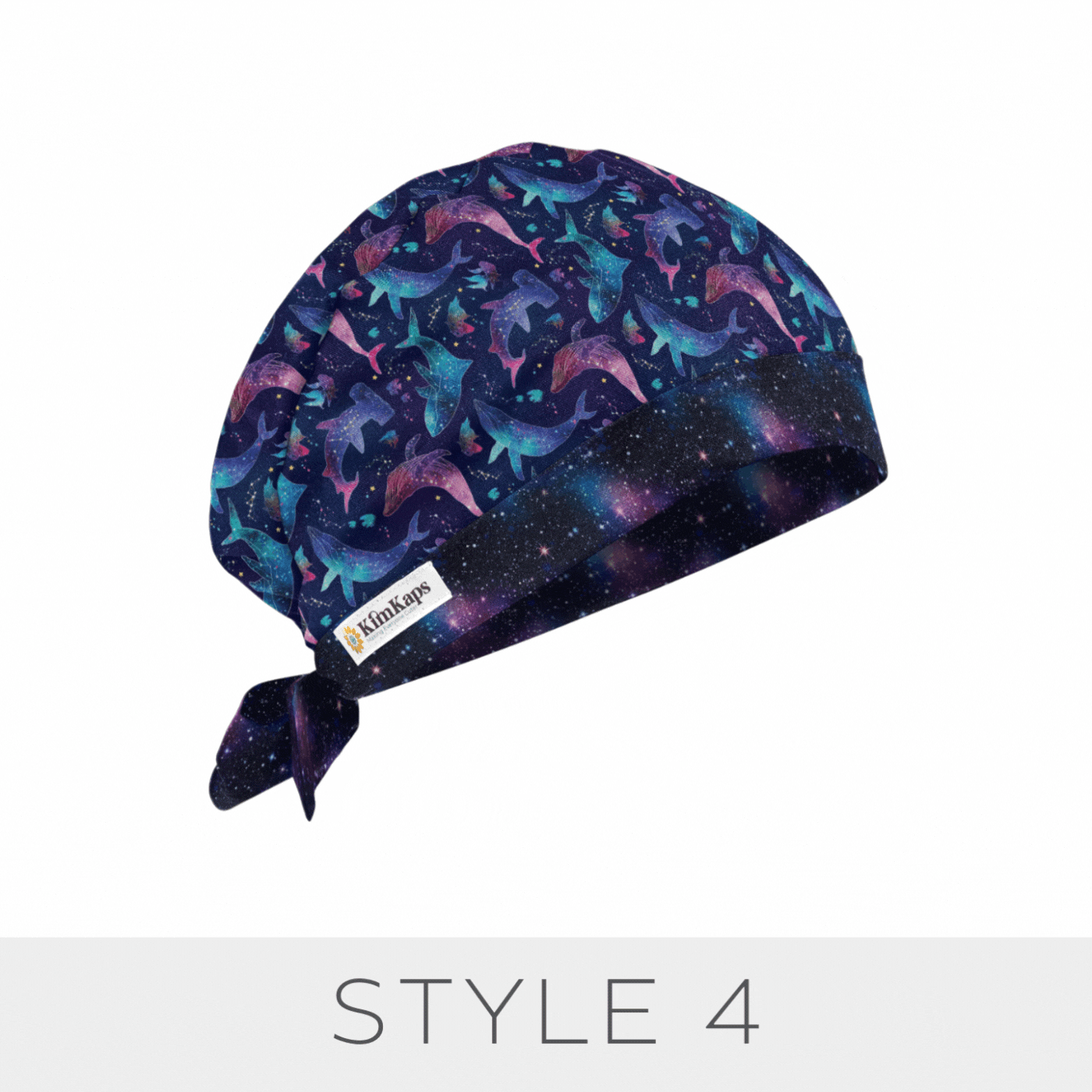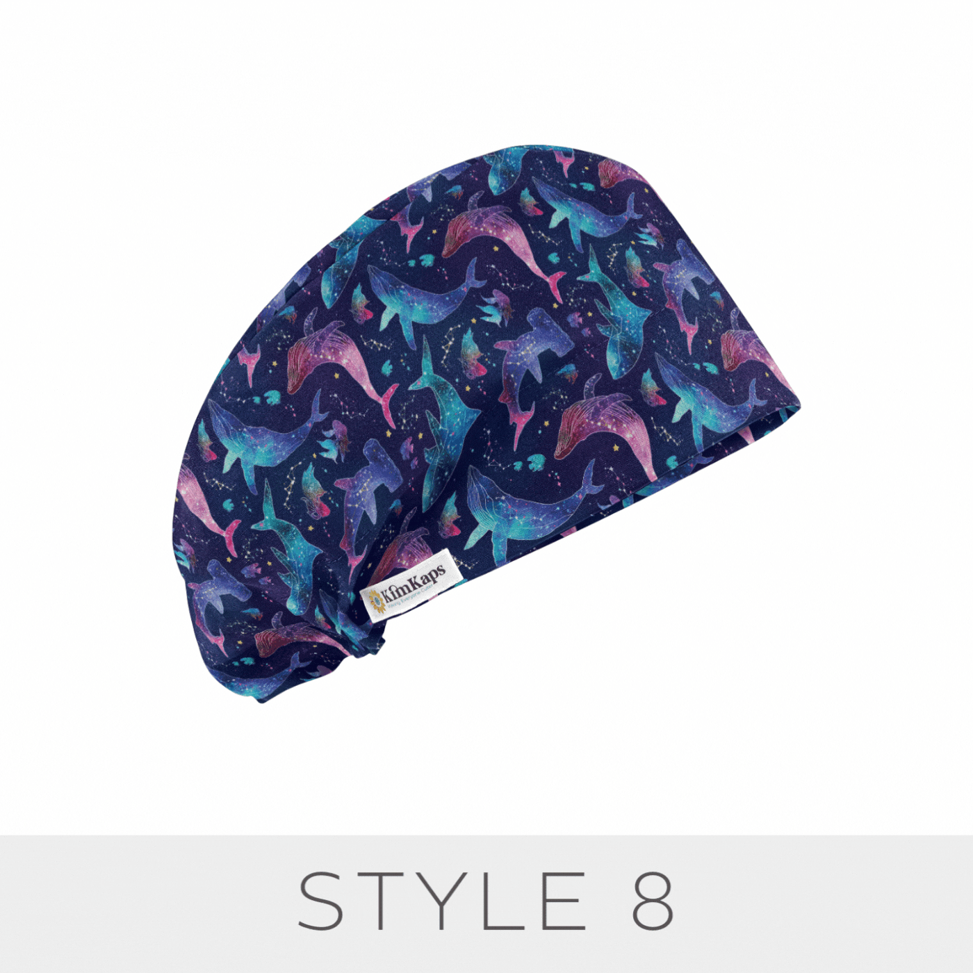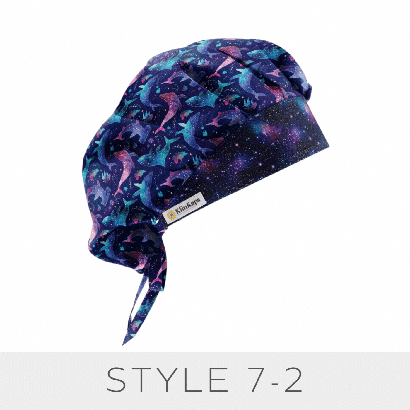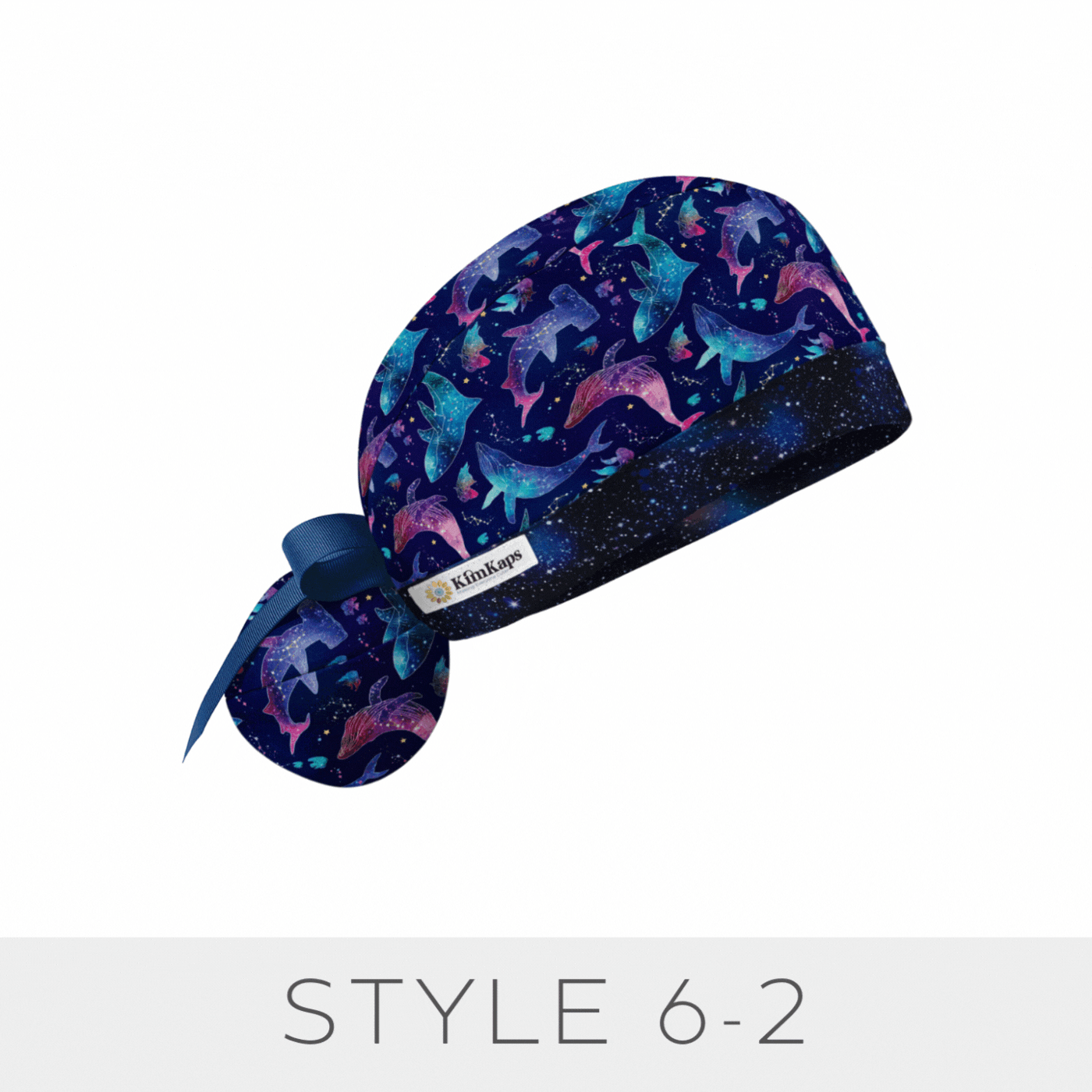 Gorgeous sea creatures in constellations mix seas and stars in this exclusive scrub cap! We added a starry coordinate and royal blue ribbons for Style 6 and Style 10.