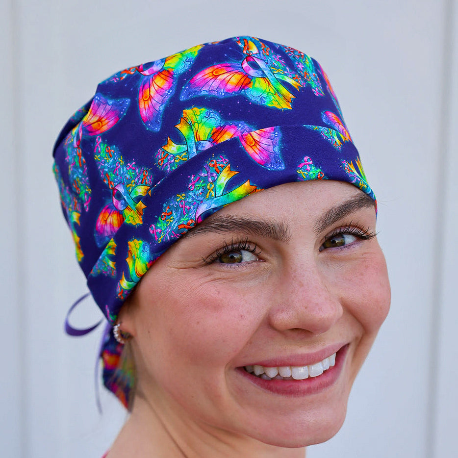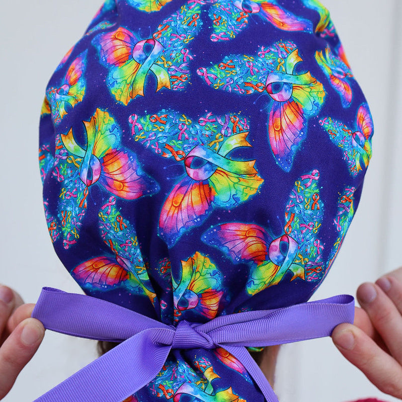 Have a cause awareness you want to show? Our Tie One On kap can cover just about any color ribbon in the rainbow! Beautiful butterflies and ribbons make a big impact on this gorgeous scrub cap, and we added purple ribbons for Style 6. You'll only find it at KimKaps!