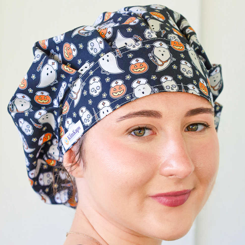 These Halloween scrub caps are made in the USA of 100% cotton, and are designed to keep you cute and comfortable all shift long.