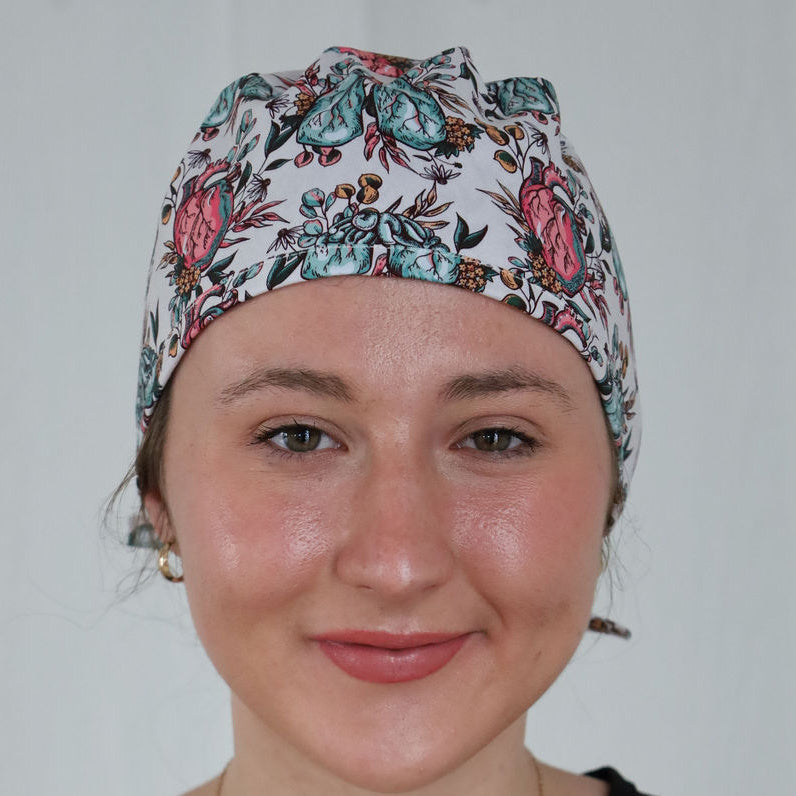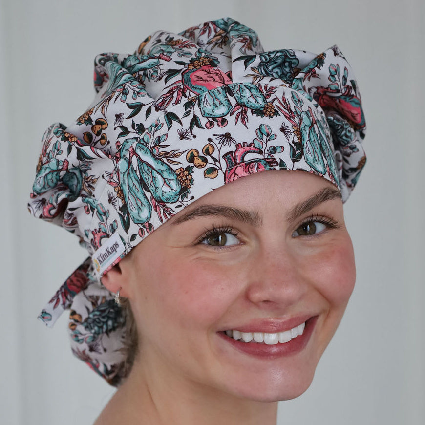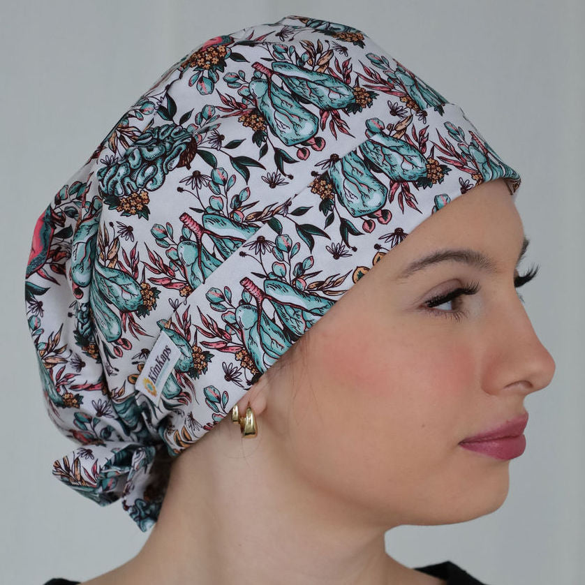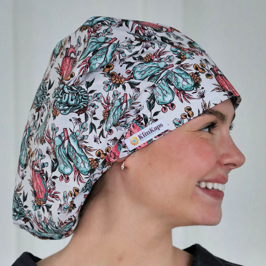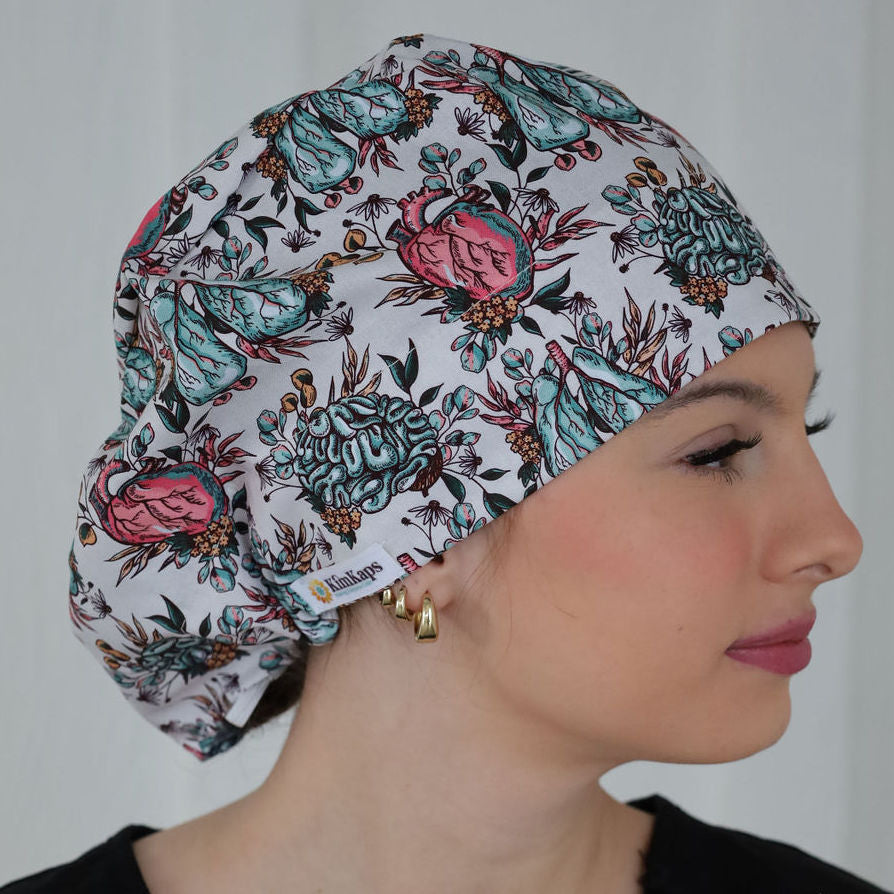 This cute scrub cap with anatomical hearts, brains, and lungs is perfect for anyone in cardiopulmonary or neurology specialties, or anyone who works in the OR! We love it with its blue teal ribbon to tie your ponytail in Style 6. Available in all your favorite styles, including bouffant, tieback, ponytail, unisex, and European. Exclusive to KimKaps!