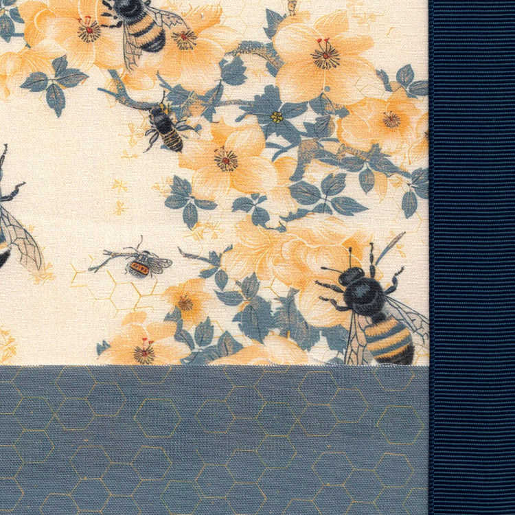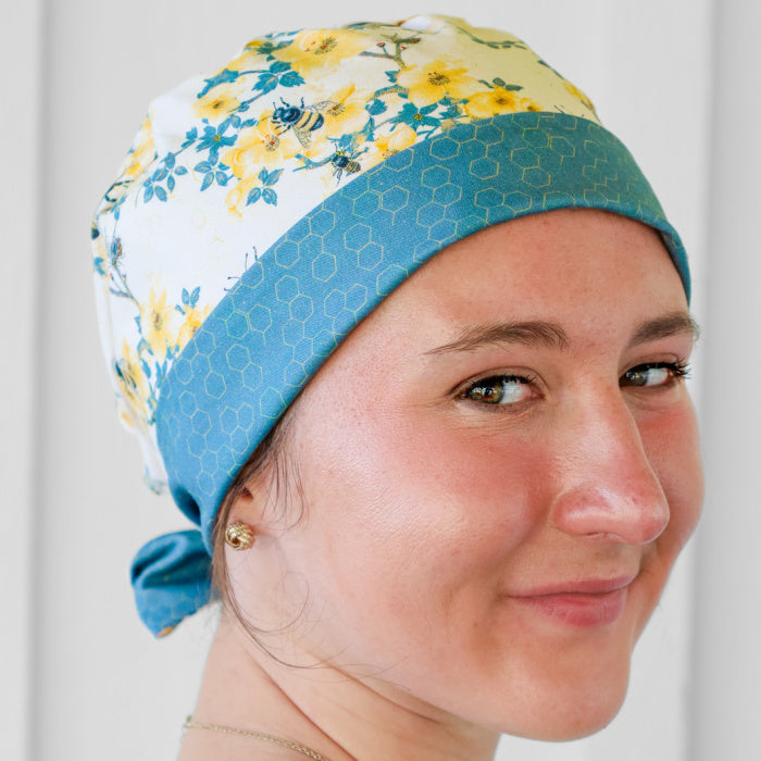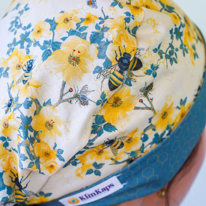 Bees, honeycomb, and yellow flowers make a happy, wildly wonderful scrub cap! We added a honeycomb coordinate, teal ribbons for Style 6, and black for style 10. Exclusive to KimKaps!